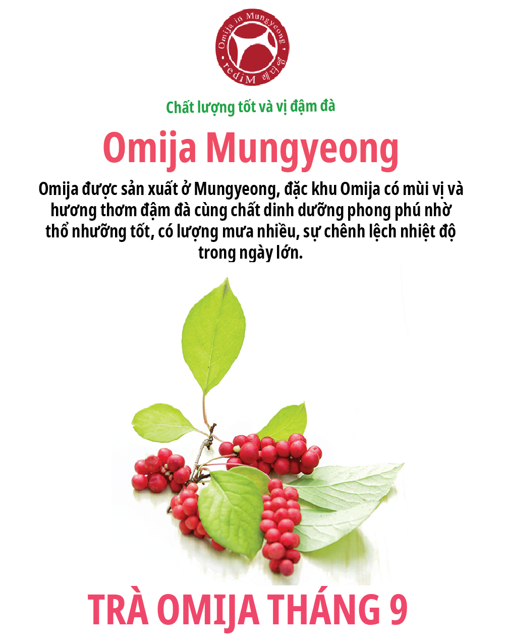 Trà Omija Tháng 9 – Mixed Omija tea of September trái Omija mọc sát nhau trông như chùm nho, thường được trồng để ăn và làm thuốc. Do nó có tới 5 vị : cay – mặn – ngọt – chua – đắng nên được gọi là Ngũ vị tử (Omija).