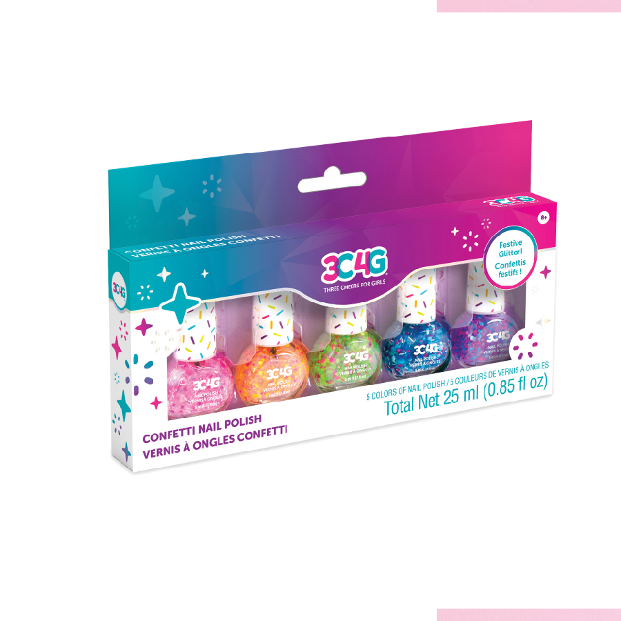 Bộ 5 lọ sơn móng với 5 màu sành điệu, được tô điểm thêm với chủ đề confetti.