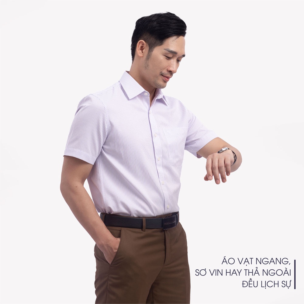 Combo Áo Sơ Mi Nam Sợi Tre Sọc Tím Và Quần Âu Tuytsi Nâu Trung Niên ANCHI Cao Cấp Bộ sản phẩm bao gồm: 01 x Áo Sơ Mi Nam Ngắn Tay Trung Niên Vải Sợi Tre Sọc Tím 01 x Quần Âu Nam Trung Niên Màu Nâu Vải Tuytsi