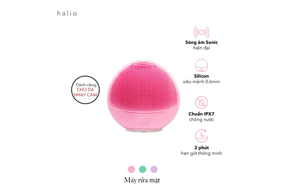1/ Đầu gai siêu mảnh chỉ 0.6mm Halio Sensitive vẫn được ứng dụng công nghệ làm sạch tiên tiến Sonic Wave Cleansing giúp làm sạch sâu và tới 99,5% bụi bẩn và dầu thừa cũng như lớp trang điểm còn sót lại - nguyên nhân chính gây mụn và dị ứng da. Đầu gai silicon cao cấp kháng khuẩn siêu mảnh 0.6mm giúp Halio Sensitive nhẹ nhàng với cả những làn da nhạy cảm nhất.