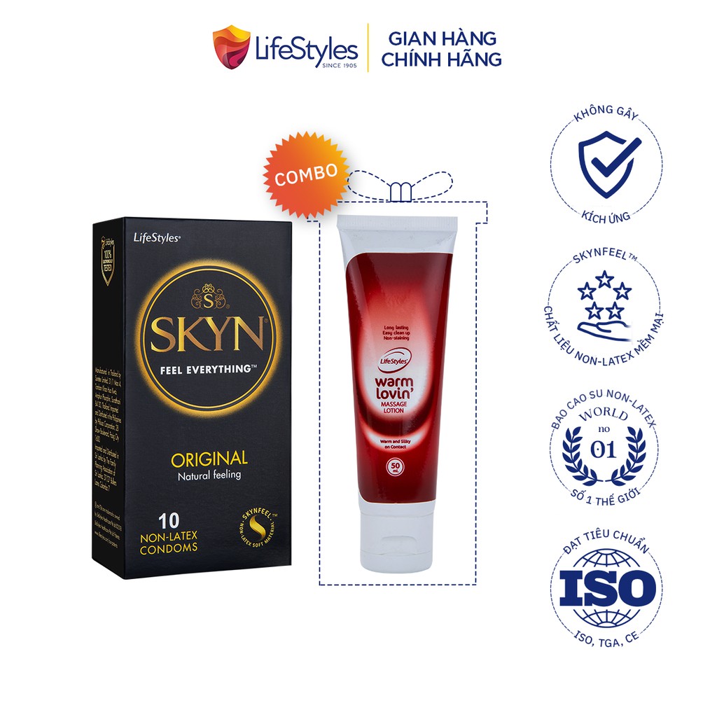 Giới thiệu Combo bao cao su Skyn Original Non-latex 10 bao + Gel bôi trơn LifeStyles Warm Lovin Massage Lotion 50ml