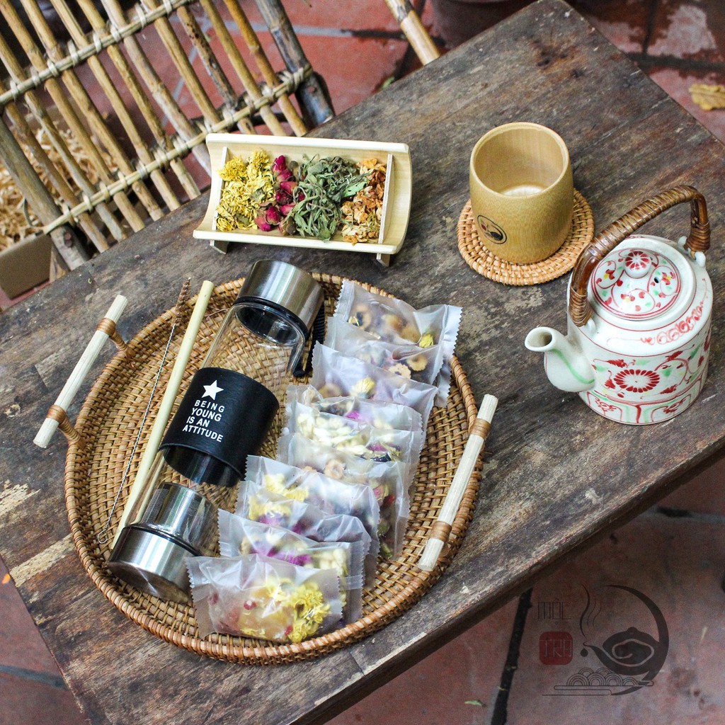 GỒM : Trà 7 vị , trà hoa cúc mật ong , trà gừng nâu , trà đường nâu thảo mộc , trà tứ hoa , trà dưỡng nhan , trà tiêu thực , cúc tâm trà , trà thanh nhiệt , liptong thảo mộc