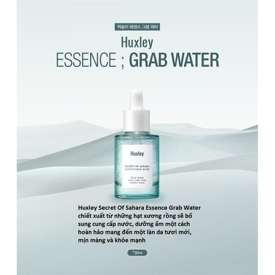 1.Tinh Chất Dưỡng Ẩm Chuyên Sâu, Dưỡng Trắng Da Chiết Xuất Xương Rồng Huxley Essence Grab Water 30ml **Thành phần - Công dụng : Tinh chất cấp ẩm, dưỡng trắng da cao cấp Huxley Essence; Grab Water với chiết xuất từ hạt xương rồng hữu cơ, có chứa chất Aquacacteen giúp cung cấp độ ẩm tức thì cho da, làm dịu làn da bị dị ứng, đặc tính dưỡng ẩm tuyệt vời do chứa hàm lượng cao các hợp chất giữ nước đồng thời tạo thêm lớp màng dưỡng ẩm, len đến tận các kẽ hở giữa các lớp tế bào, đảm bảo cho da luôn trong trạng thái ẩm mượt, đầy sức sống.85% Chiết xuất xương rồng: Cung cấp độ ẩm, vitamin E, chống lão hóa. Yếu tố giữ ẩm tự nhiên N.M.F (Hyaluronic / Ceramide): Gia tăng độ ẩm tự nhiên của da . Hương bạc hà tự nhiên có trong sản phẩm tạo cảm giác mát lạnh tức thì cho da. Lá cây trà Mate chống oxy hóa, tăng cường khả năng miễn dịch và mang lại sức sống cho làn da mệt mỏi. Cân bằng độ ẩm để kiểm soát bã nhờn, giúp giảm tình trạng da bị bóng nhờn bên ngoài và khô từ sâu bên trong. Sản phẩm làm đều màu da, cải thiện tone da, giúp da trắng sáng, mịn màng