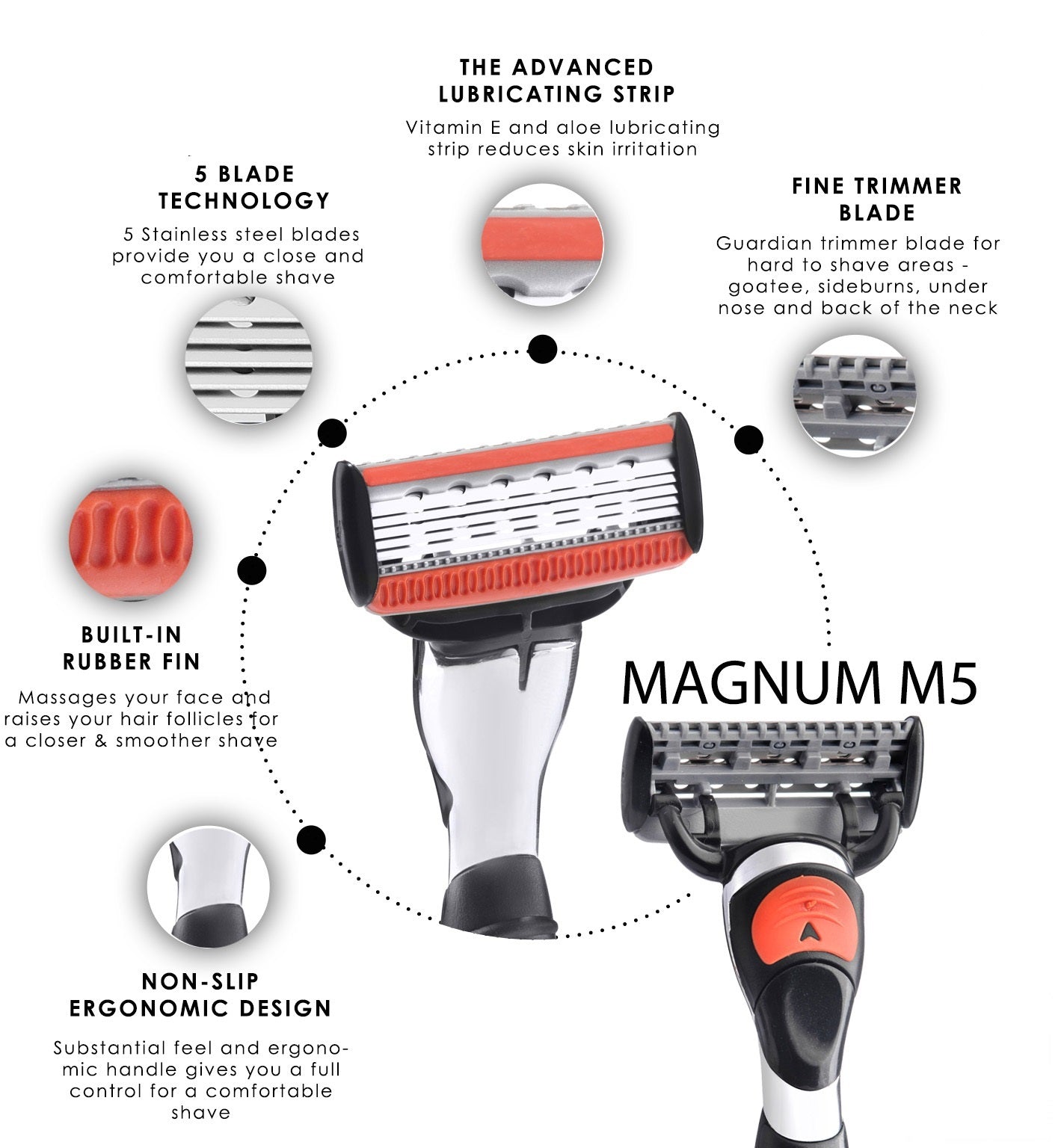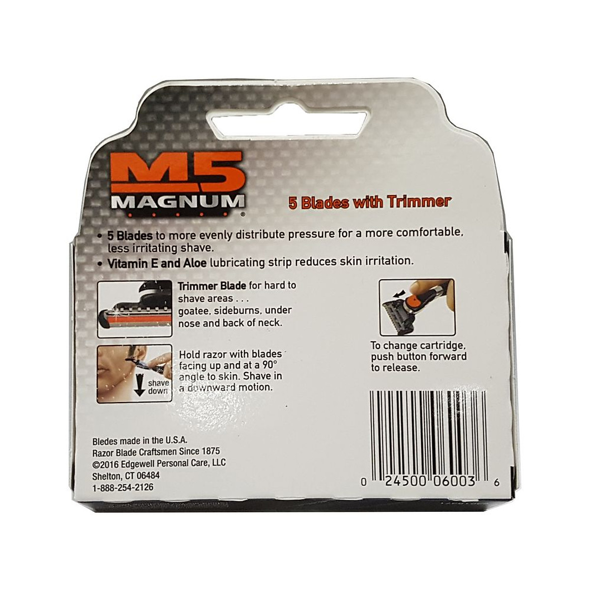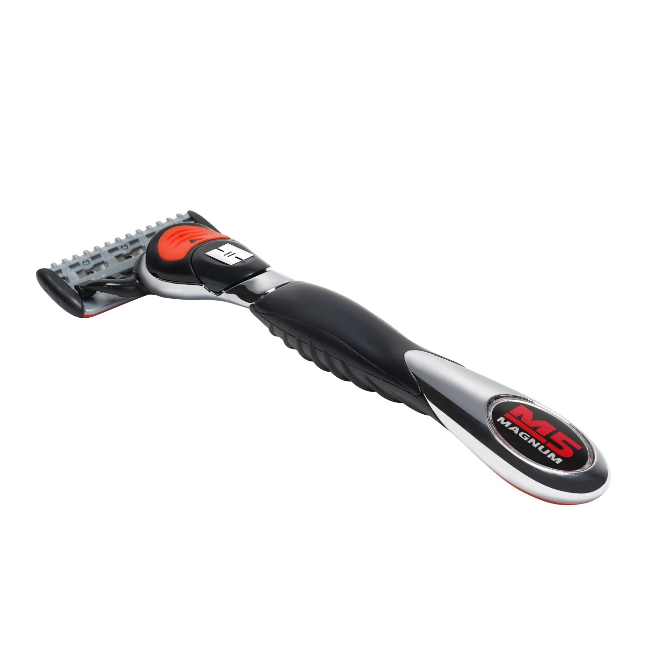 Cũng như đa số dao cạo râu trên thị trường hiện nay. Dao cạo M5 magnum cũng gồm 2 phần tách biệt đó là lưỡi cạo râu M5 magnum và bộ phận tay cầm. Trên tay cầm sử dụng nút bấm để tách rời đầu cạo và cán dao.