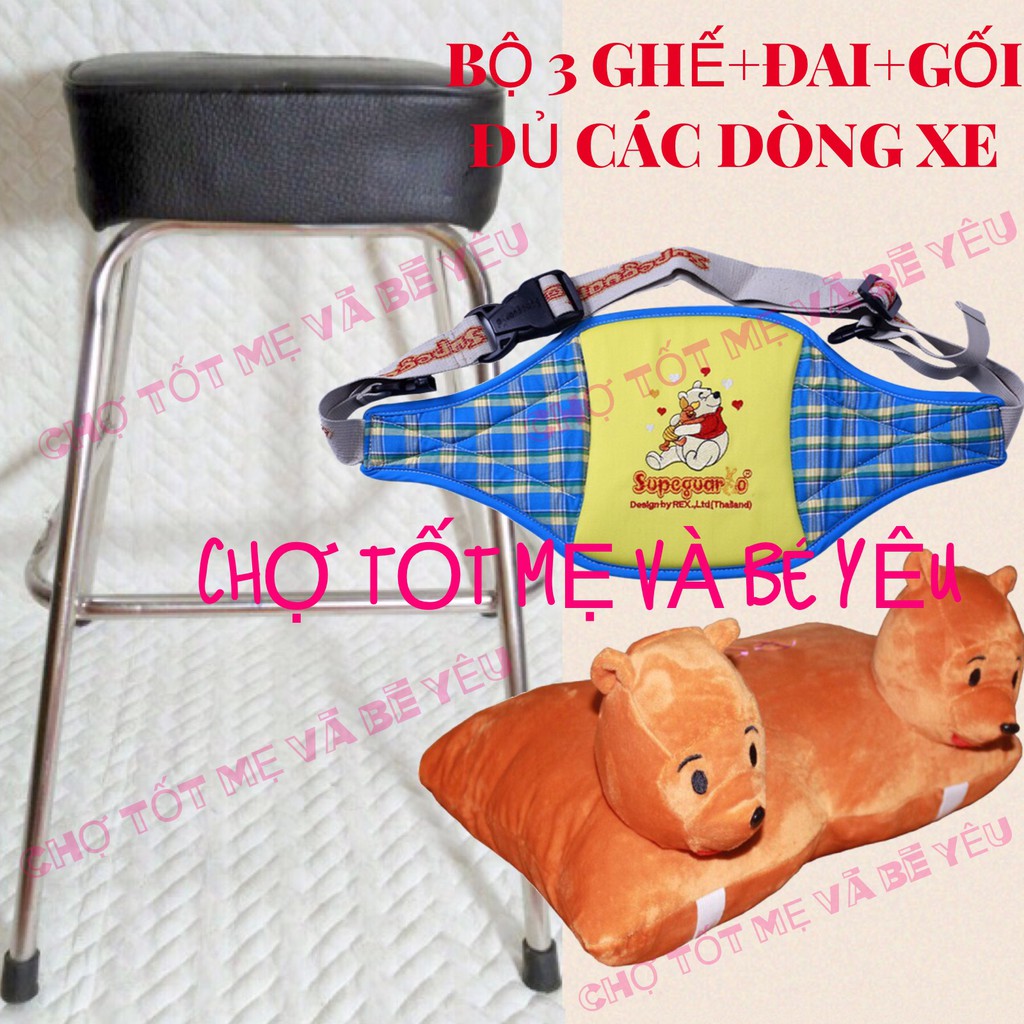 COMBO 3 MÓN TRỌN BỘ GỒM: GHẾ INOX XE GA + ĐAI AN TOÀN + GỐI THÚ CHỐNG VA ĐẬP,NGỦ GẬT CHO BÉ. ***LƯU Ý: - Ghế inox không tựa lưng dành cho các bé ngồi vững tầm 2 tuổi trở lên. - Gối và đai an toàn màu sắc sẽ thay đổi theo từng đợt hàng, shop giao màu ngẫu nhiên theo phân loại bé trai & bé gái. - Mỗi loại xe sẽ dùng ghế có thiết kế riêng cho xe đó, các bạn đặt hàng nhớ đọc và chọn đúng phân loại giúp shop, mình sẽ liên hệ với các bạn để check thông tin và giao đúng ghế chuẩn với form xe nên bạn hoàn toàn yên tâm và tin tưởng khi mua sản phẩm tại shop. PHÂN LOẠI NHÓM XE: 1. SCR,LEAD,SPACY,MIO,CLASSIO 2. ATILA,NOZA 3.SH,PS,CLICK,VISION,LIBERTY 4. AIRBLACK 1,2,3, PCX 5. NOVOU, VESPA,HAYATE --------CAM KẾT HÀNG CHUẨN CHẤT LƯỢNG VÀ AN TOÀN CHO CON YÊU------- 1)GHẾ INOX XE GA : thiết kế đơn giản với đệm ngồi êm ái, khung sườn chất liệu inox chắc chắn chịu được trọng lượng tương đương với số kg của người lớn, mẫu mã gọn nhẹ sử dụng đơn giản chỉ cần đặt ghế lên xe thắt đai an toàn là có thể chở bé vivu, đây sẽ là chiếc ghế tiện dụng bởi tính năng và giải quyết nỗi lo của các mẹ tay lái yếu mang lại cảm giác an toàn không chênh vênh vướng víu... 2) Đai an toàn thương hiệu SUPEGUARDO: vật dụng không thể thiếu khi tham gia giao thông bảo vệ an toàn cho con yêu. - Đai an toàn thắt gắn kết cố định giữa bé và bố/mẹ bảo vệ bé khi gặp sự cố thắng gấp, bé ngủ gật, bé quậy không chịu ngồi yên khi lái xe... - Đai có thiết kế dùng cả 2 tư thế: khi bé ngồi trước và cả ngồi sau, tiện lợi và bền lâu. - Chất liệu vải cao cấp, mềm mịn, thoải mái, có dây tăng giảm theo vòng lưng của bố mẹ cho phù hợp. - Thiết kế nhỏ gọn, dễ dàng cất giữ hoặc mang theo mỗi khi bé đi xe máy cùng ba mẹ . - Phụ kiện được nhập khẩu trực tiếp từ Thái Lan, móc khóa đã được kiểm định chịu được trọng lượng lên đến 40kg. 3) GỐI THÚ ĐI XE: - Chất liệu: vải nhung và bông mềm mại - Nơi sản xuất: Việt Nam - Bảo vệ bé khi đi xe thắng gấp, ngủ gật #ghedixemay #goidixemay