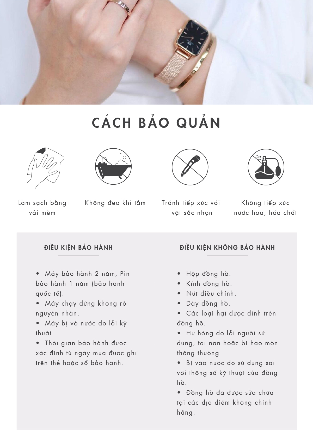 - Bộ sản phẩm gồm: Sản phẩm chính hãng, hộp, sổ bảo hành, túi Daniel Wellington.