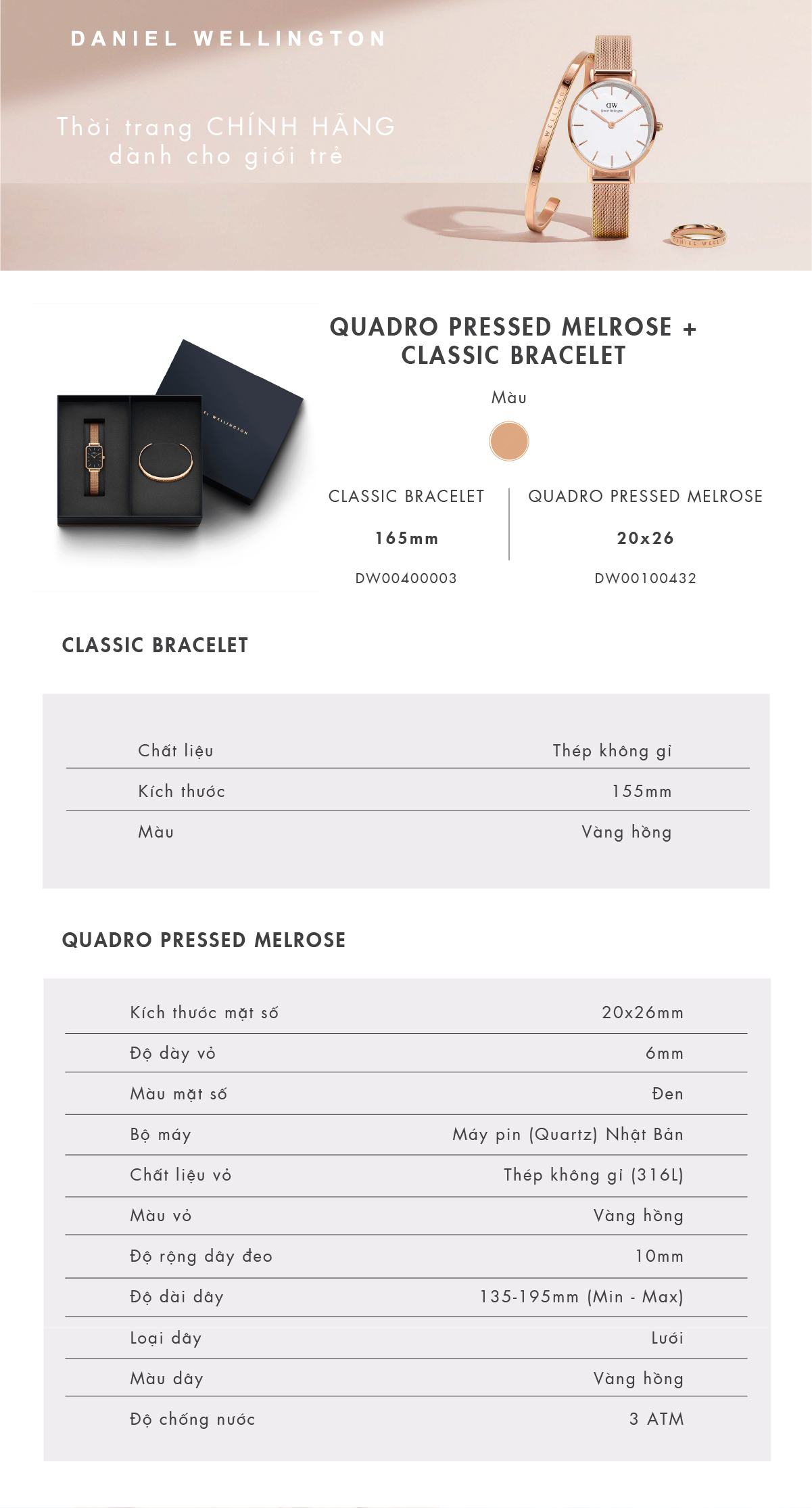 Combo Gift Nữ Daniel Wellington Đồng hồ Quadro Pressed Melrose DW00100432 + Vòng tay Classic Bracelet DW00400003
