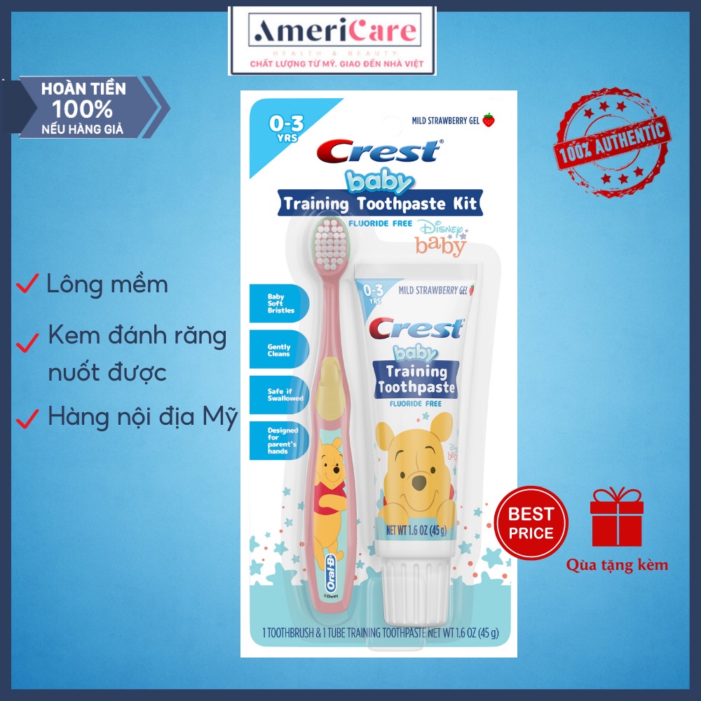 Giới thiệu Combo Kem Đánh Răng Cho Bé Nuốt Được và Bàn Chải Đánh Răng Lông Mềm cho Bé 0-3 tuổi Crest (Americare, Bill Mỹ)