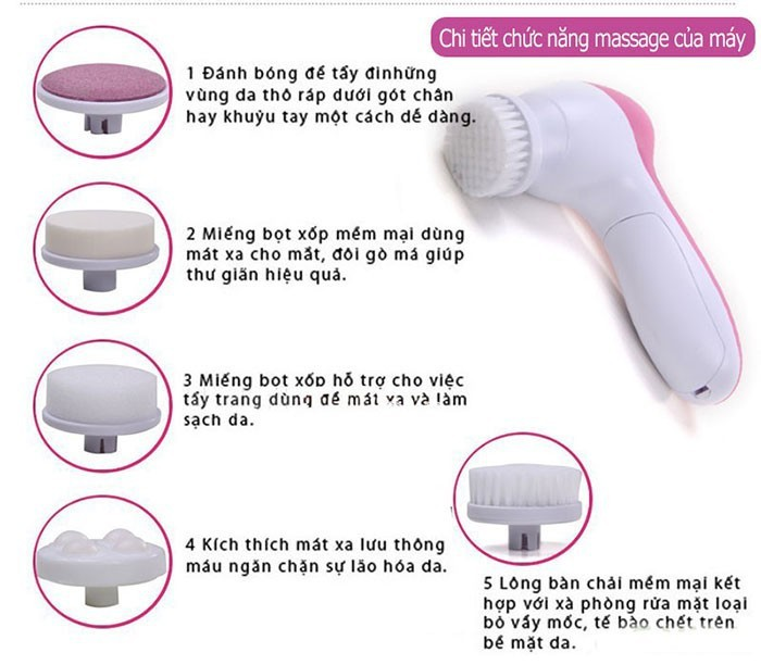 Máy Massage mặt 5 in 1-beauty care Massager được sản xuất theo công nghệ tiên tiến thay thế cho phương pháp rửa mặt thông thường, giúp làm sạch sâu lỗ chân lông, giải trừ độc tố tích tụ dưới da cho da sạch,ngăn ngừa mụn và có đầu mút có thể dùng để đánh kem nền khi trang điểm giúp da đều màu, Massage nâng cơ mặt, tẩy tế bào chế Vô cùng tiện lợi.