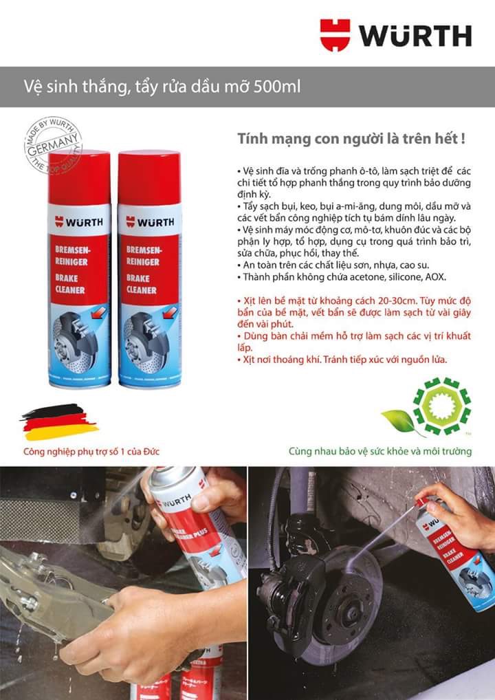 II. VỆ SINH DẦU MỠ THẮNG (PHANH) ĐĨA WURTH BRAKE CLEANER 500ML