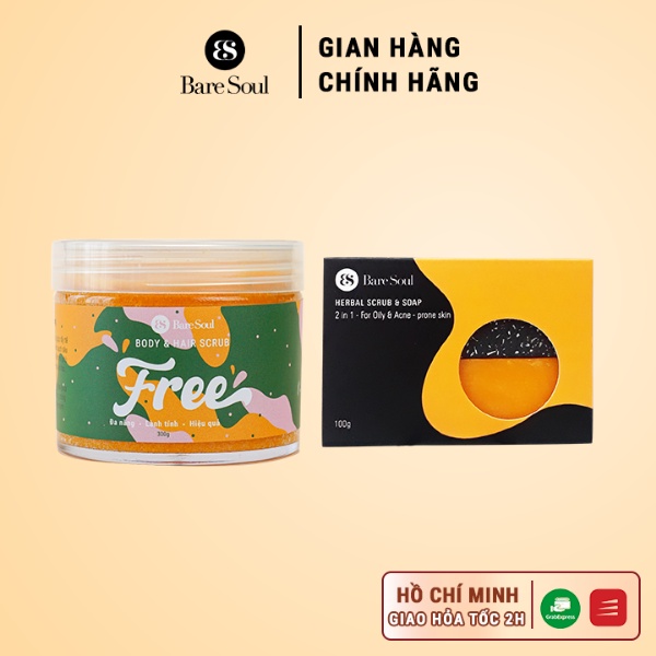 2. BareSoul Herbal Scrub & Soap 15 thành phần tự nhiên , 2 chức năng song hành: tẩy tế bào chết giảm mụn và nuôi dưỡng, làm mờ vết thâm. Sản phẩm 100% thành phần thiên nhiên, thân thiện với môi trường, không có dầu cọ và thay thế hạt vi nhựa bằng cơm dừa để tẩy da chết. Bánh đen bộ tứ thành phần than hoạt tính, cơm dừa non, tinh dầu bạc hà và dầu tràm - Tẩy tế bào chết làm sạch sâu - Detox, thải độc, lấy đi bã nhờn, vi khuẩn - Làm sạch các lỗ chân lông, kiểm soát dầu, ngăn giúp ngăn ngừa các bệnh về da. - Giảm mụn cơ thể, mông, lưng, ngực, và viêm lỗ chân lông Bánh cam óng mượt với bộ tứ thành phần từ rễ nghệ tươi, tinh chất lô hội, bơ hạt mỡ, dầu cam giúp làm se khít lỗ chân lông. Sản phẩm 100% thành phần tự nhiên, không chứa chất bảo quản tạo màu, tạo mùi, dầu khoáng, cồn, sulfates. - Dưỡng ẩm sâu cho da - Mùi cam thơm nhẹ sảng khoái - Giúp làm sạch sâu, thông thoáng lỗ chân lông - Dưỡng sáng da, mờ thâm