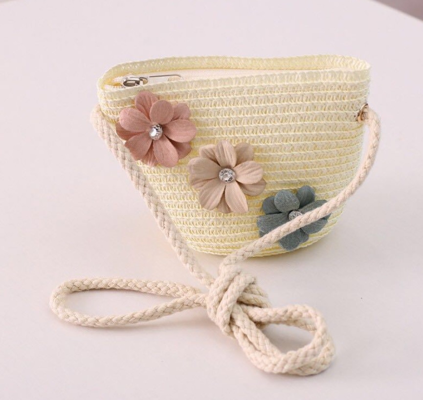 Bộ phụ kiện thời trang nón và túi đeo chéo cho bé cùng màu cùng tông và cùng kiểu hoa trang trí.