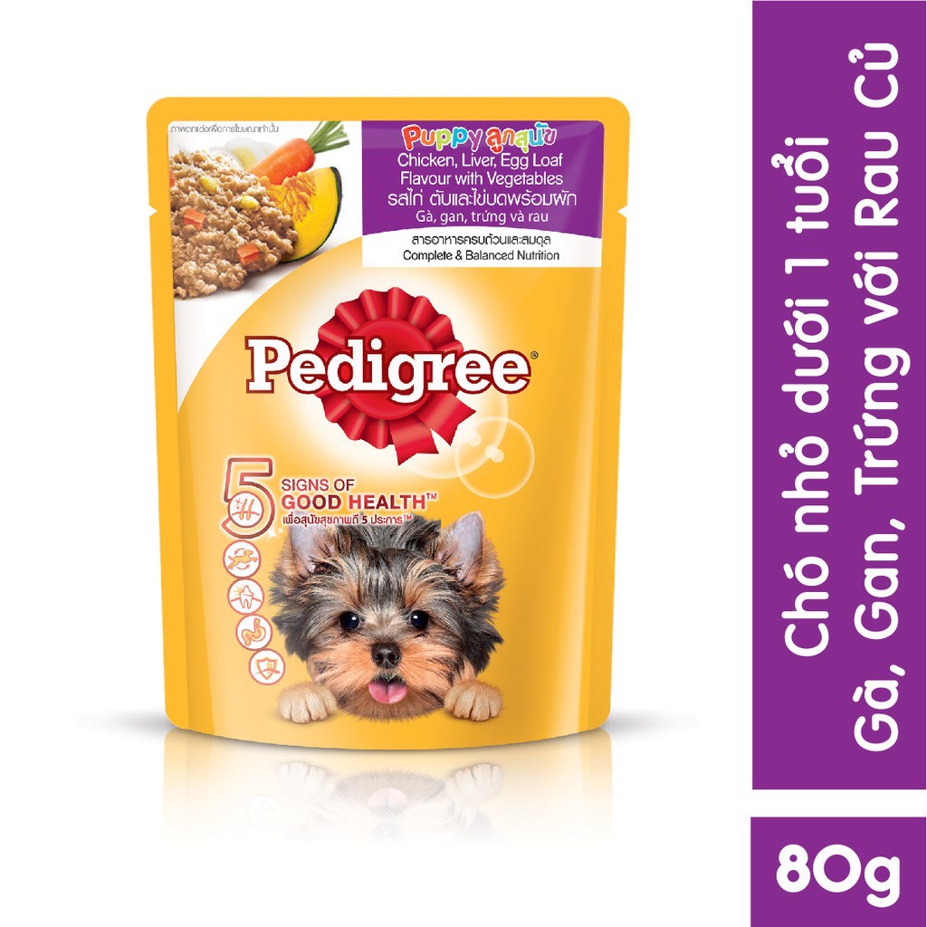 Giới thiệu Combo Thức ăn Chó Con Pedigree vị gà, sữa & trứng túi 1.3kg + 6 túi Sốt chó con 80g vị gan,gà,trứng,rau củ