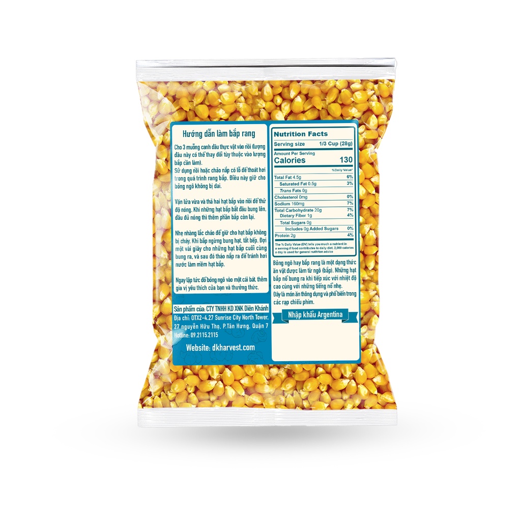 BẮP HẠT NỔ POPCORN DK HARVEST MÔ TẢ: Bỏng ngô hay bắp rang là một dạng thức ăn vặt được làm từ ngô (bắp) bằng cách rang những hạt bắp và các hạt nổ bung ra khi tiếp xúc với nhiệt độ cao kết hợp với những tiếng nổ nhẹ phát ra. Đây là món ăn thông dụng và phổ biến trong các rạp chiếu phim.