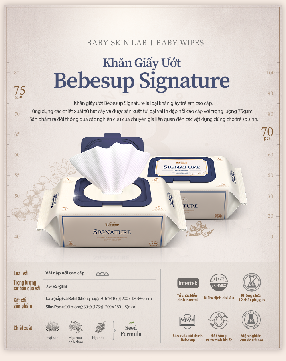 BEBESUP là loại khăn ướt cho cho trẻ em , được bình chọn là sản phẩm có lượng tiêu thụ cao trong tất cả các sản phẩm khăn ướt của Bebesup. Sản phẩm được làm bằng vải dập nổi độ dày 50gsm, chứa chiết xuất từ những thực phẩm xanh, để giữ cho làn da của bé sạch sẽ và không gây kích ứng.
