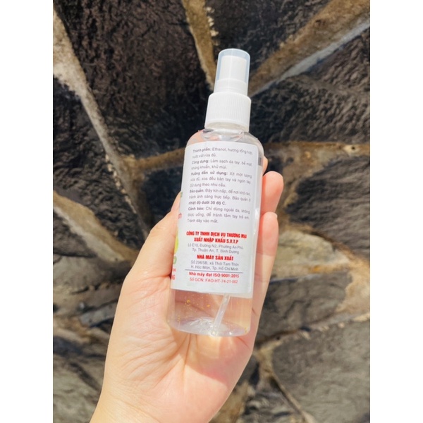 Cồn 70 Độ Chai 100ML Có Vòi Xịt Đa Dụng Tiện Lợi, An Toàn , Chất Lượng , Sát Trùng Vết Thương , Bảo Vệ Sức Khỏe Mô tả sản phẩm : -Xuất xứ : Việt Nam -Dung tích 100ml -Thành phần : thành phần hoạt chất 70% v/v Ethanol Công dụng: - Sát Trùng ngoài da, Làm chất dung môi trong y tế - Với thành phần chính là ethanol được dùng: sát trùng dụng cụ, sát trùng da trước khi tiêm, sát trùng vết thương - Cồn trắng 70 độ có thể dùng để nướng khô, mực... tiện lợi, nhanh, gọn, lẹ và nó cũng rất dễ làm. Lưu ý : -Chỉ sát trùng ngoài da; -Không trực tiếp tiếp xúc cồn y tế với bất kì bộ phận nào trên cơ thể; -Không được pha trực tiếp cồn y tế dùng uống; -Khi tiếp xúc với hơi cồn phải đeo khẩu trang y tế; -Khi dính cồn y tế vào mắt phải rửa ngay lập tức với nước sạch. -Khi nuốt phải cồn y tế không cố gây nôn mà uống ngay nước lọc và đưa đến bệnh viện gần nhất. Hướng dẫn sử dụng : -Mở nắp xịt , xịt các vùng có nguy cơ lây nhiễm vi rút , vi khuẩn , đặc biệt ở môi trường công cộng . Dung dịch sử dụng nguyên chất không pha loãng