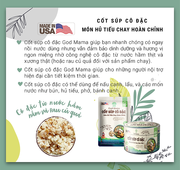 Hướng dẫn sử dụng | Chuẩn bị 1 nồi nước sôiCho Cốt súp Cô Đặc theo định lượng (1 muỗng cà phê cốt súp cô đặc : 240 ml nước) vào rồi hòa tanCó ngay nồi nước dùng hầm từ nấm và rau củ quả, vị hủ tiếu chay đúng chuẩnCho thêm các nguyên liệu vào và nấu món cần dùng |