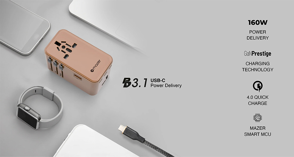 Mazer GaN Prestige 160W là củ sạc mạnh mẽ, an toàn và tiện lợi, đáp ứng nhu cầu sạc cho nhiều thiết bị như laptop, smartphone, tablet và phụ kiện thông minh. Sản phẩm tích hợp công nghệ GaN tiên tiến, hệ thống bảo vệ thông minh và thiết kế toàn cầu linh hoạt. Mazer GaN Prestige 160W là "trạm năng lượng bỏ túi" lý tưởng, phục vụ cho người dùng hiện đại, sẵn sàng đồng hành trong mọi hành trình.