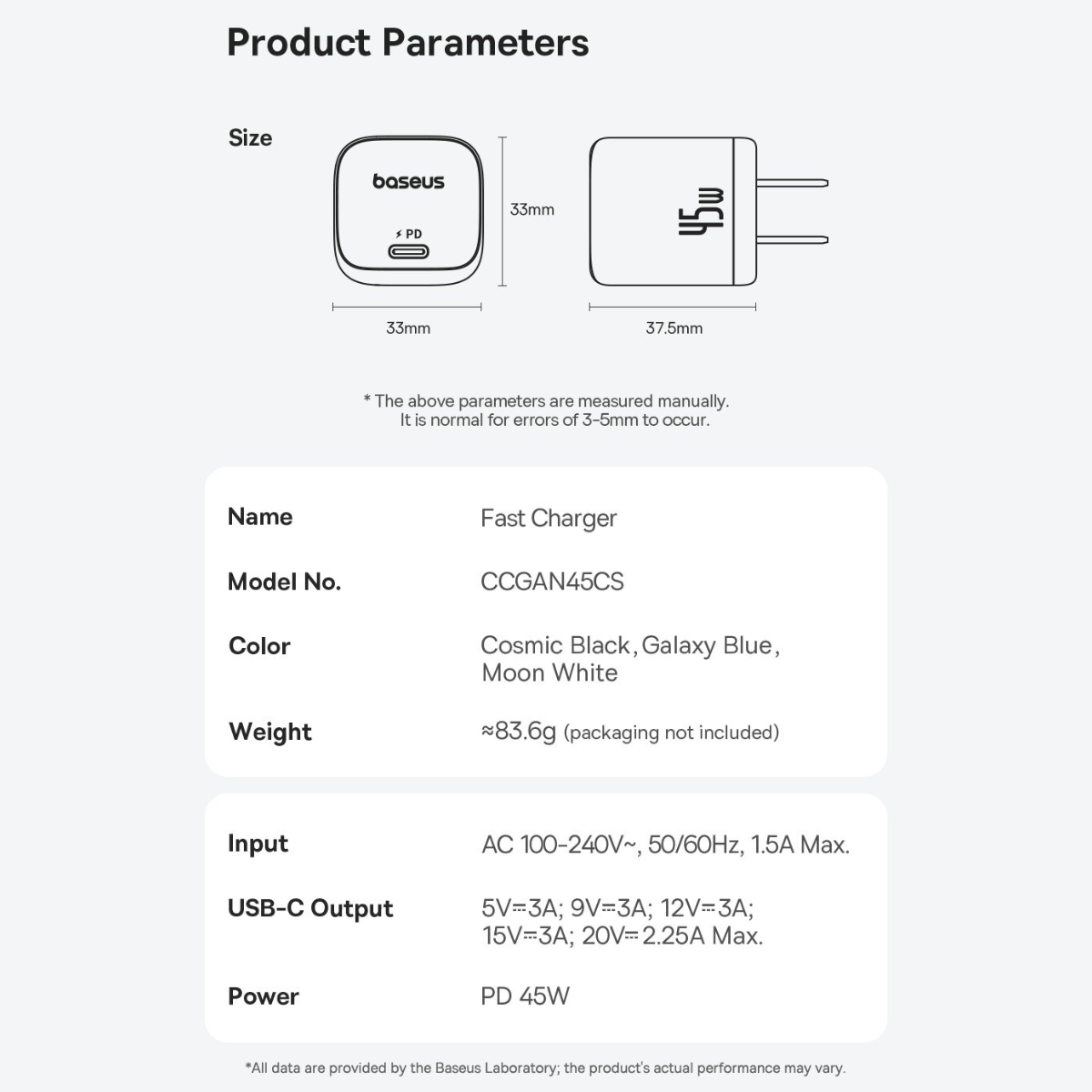- Củ sạc Baseus PicoGo GaN 1 Cổng PD 45W được thiết kế để tương thích với hầu hết các thiết bị sử dụng cổng USB-C. Không thể sạc chỉ cho các dòng iP, i-Pad của Ap-ple, sản phẩm còn hỗ trợ nhiều thiết bị Android, máy tính xách tay và các thiết bị điện tử khác.