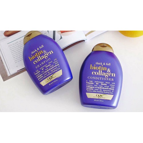 - Trong khi Provitamin B7 Biotin giúp thấm sâu vào từng sợi tóc thì collagen giúp tăng cường độ đàn hồi, kích thích tóc mọc nhanh hơn. Bộ đôi ProVitamin B7 Biotin và collogen kết hợp trong sản phẩm Dầu gội Biotin và Collogen OGX được xem là giải pháp hoàn hảo cho những ai có mái tóc gặp nhiều vấn đề như tóc khô xơ và hay gãy rụng.