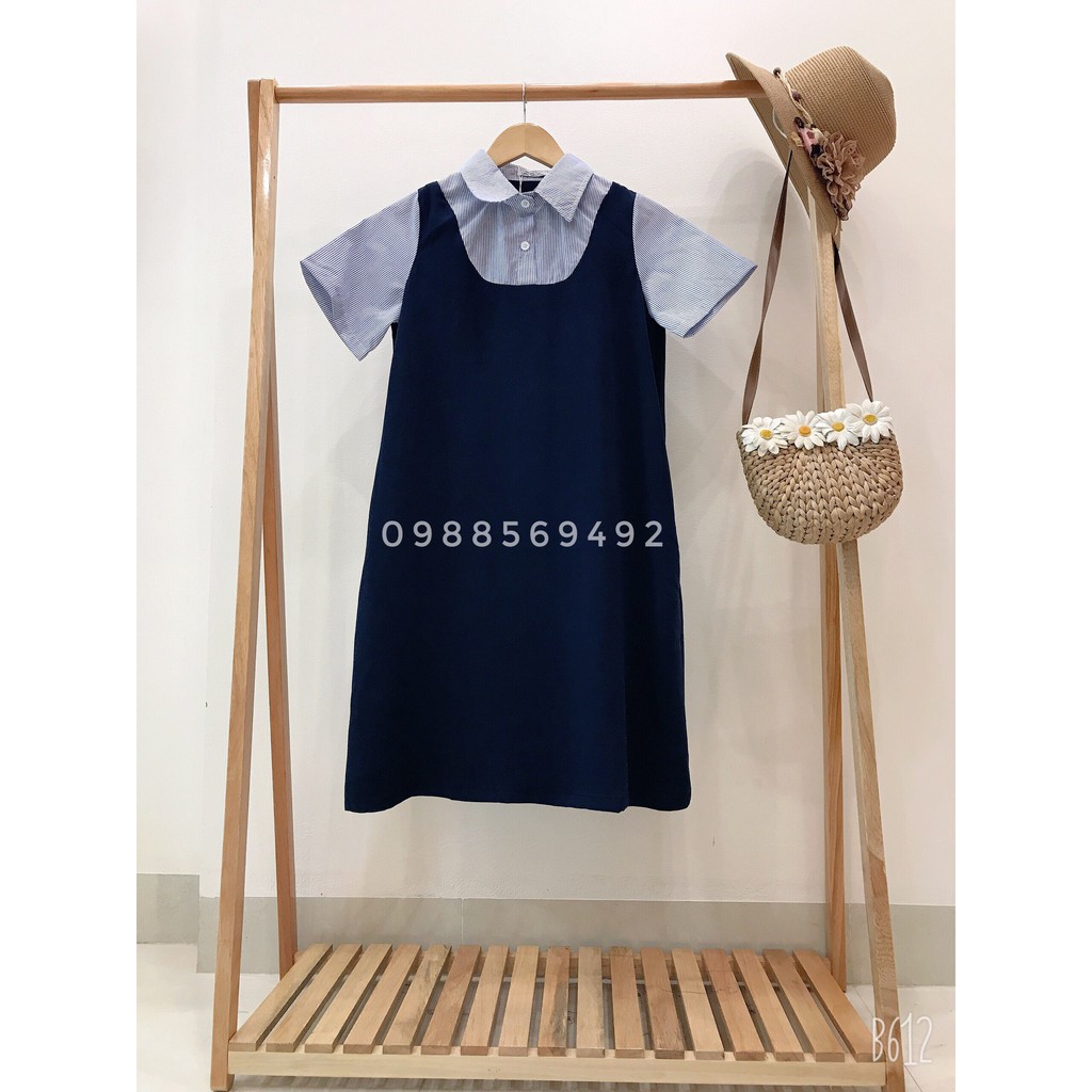 Giới thiệu Đầm bầu công sở Váy bầu đẹp Xanh Than Phối Kẻ Cổ Đức Cộc Tay MYC1217