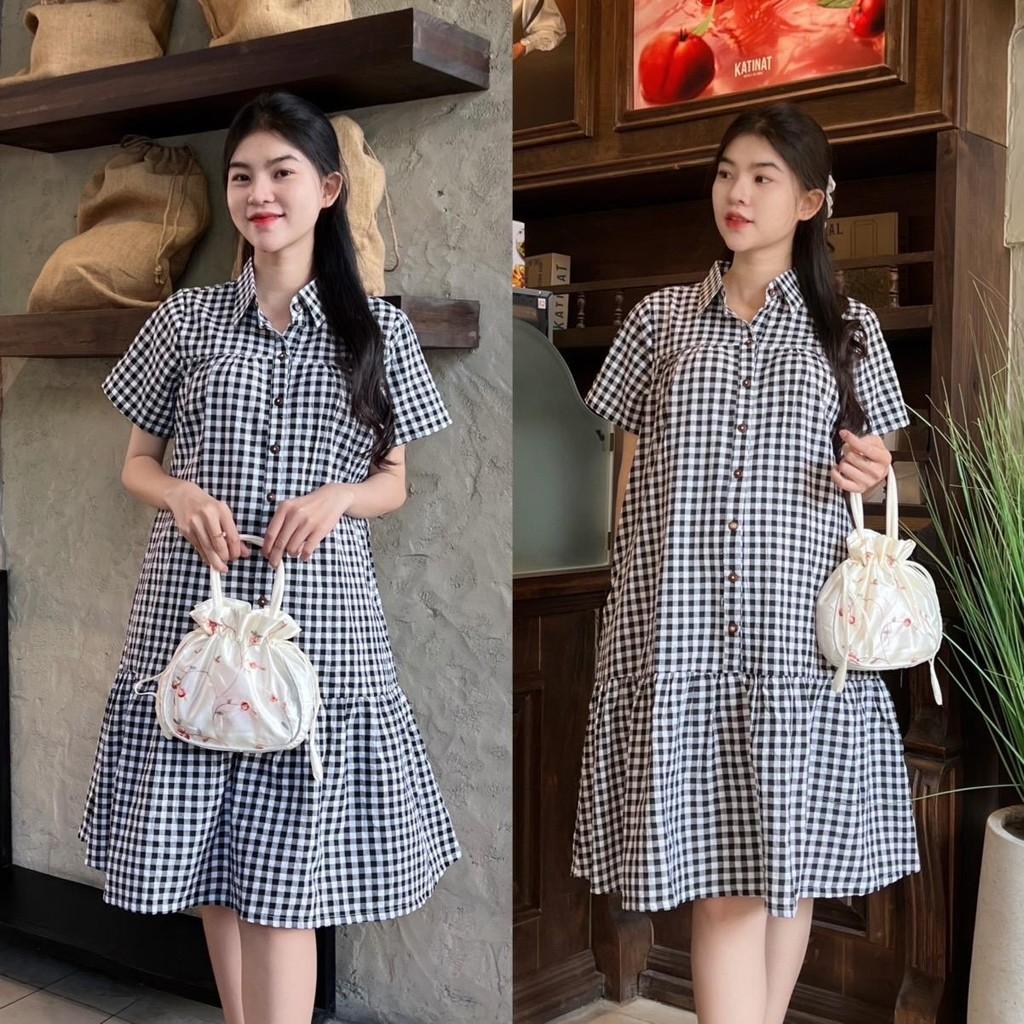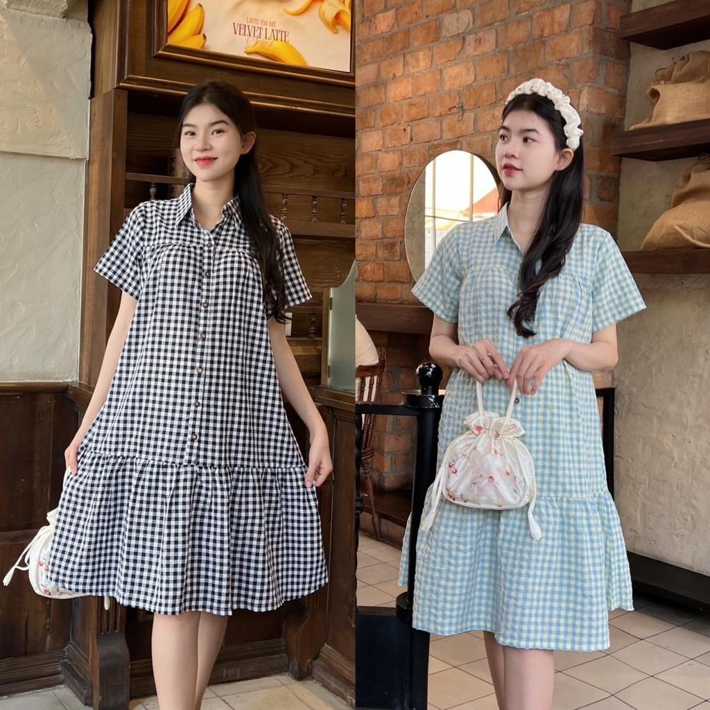 Giới thiệu Đầm bầu karo cổ sơ mi phối nút phom đuôi cá dễ thương, trẻ trung diện đi làm, đi chơi - Đen