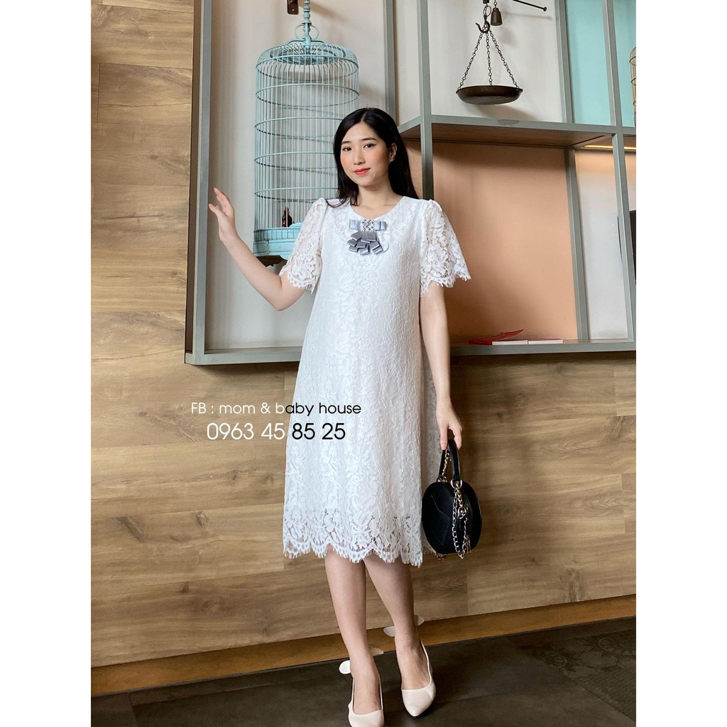 Giới thiệu Đầm bầu ren trắng đính kèm hoa ( có video )