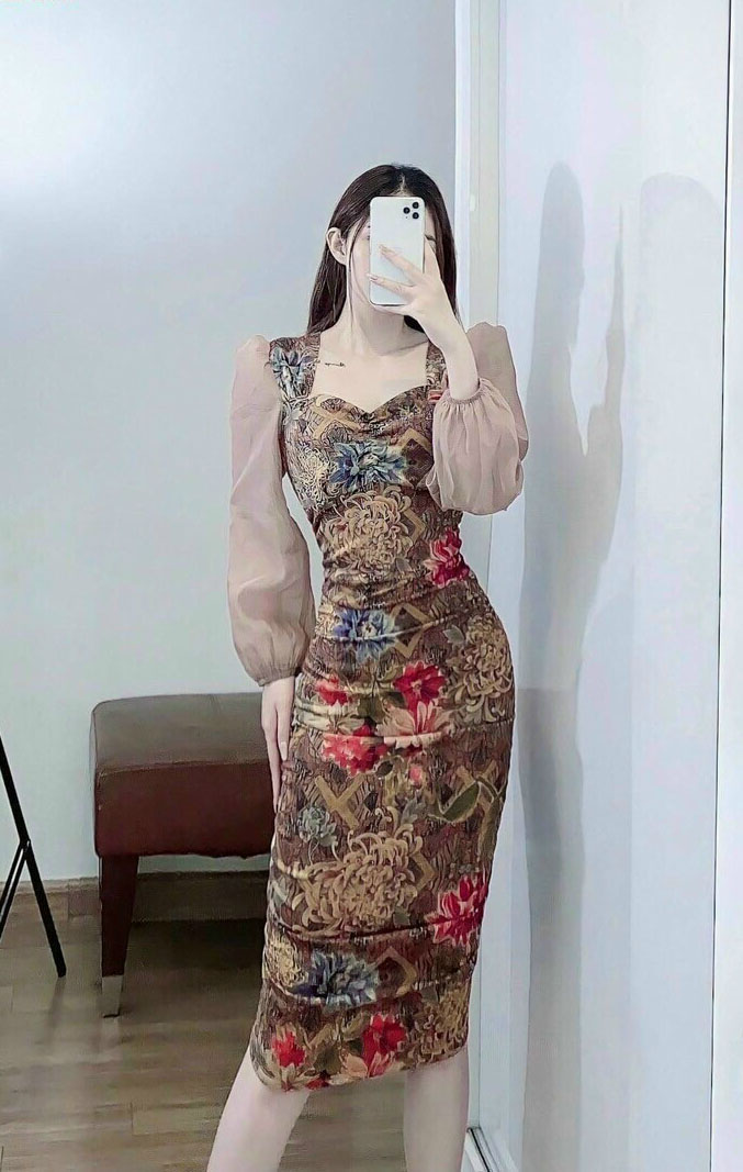 Thiết kế Đầm body họa tiết hoa lá tay phồng thời trang cao cấp phong cách đường may tỉ mỉ.