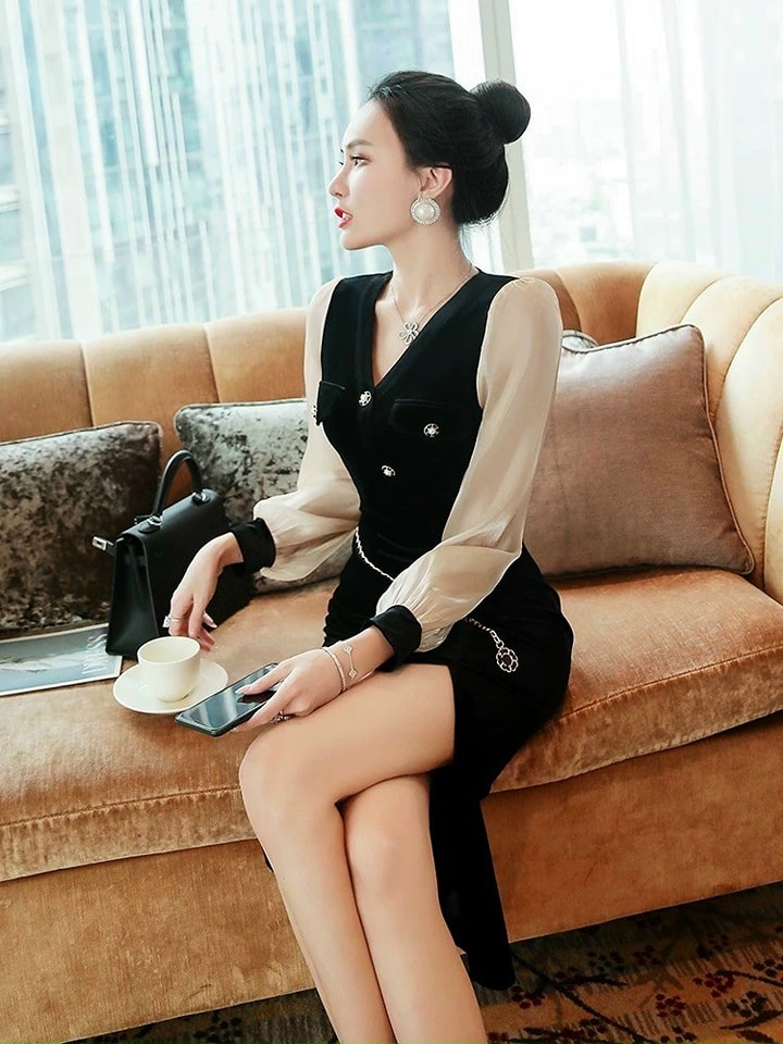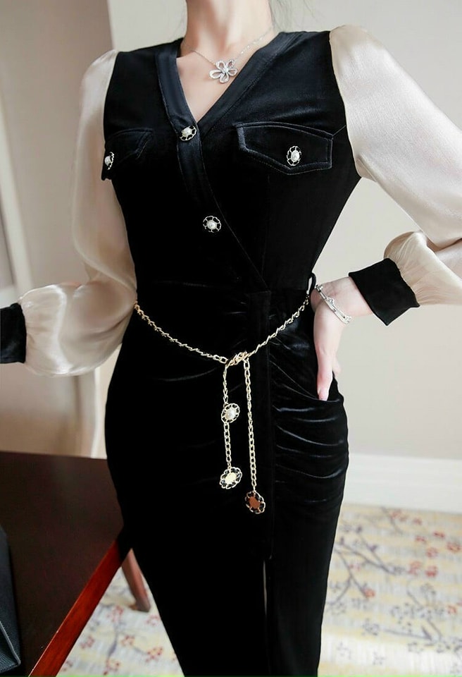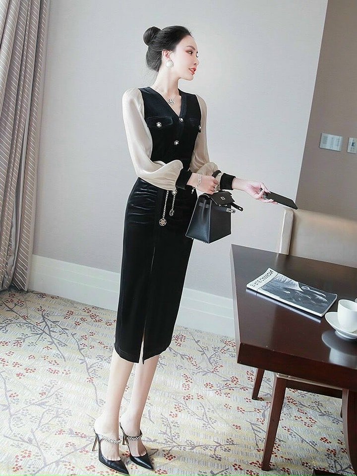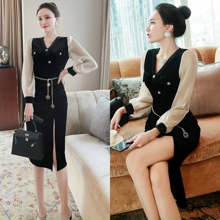 ĐẦM BODY NHUNG TAY DÀI CHÂN VÁY XẺ TÀ KÈM DÂY THẮT LƯNG THỜI TRANG