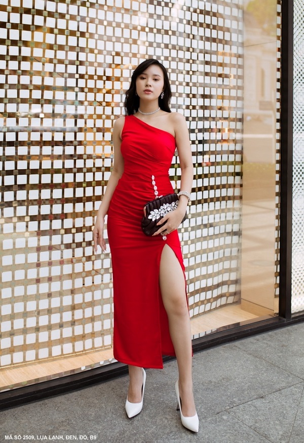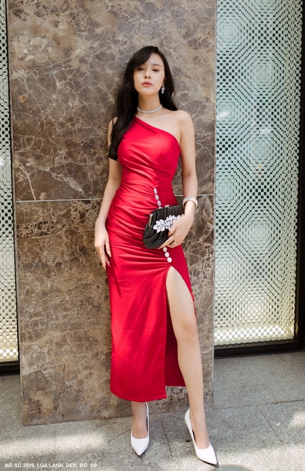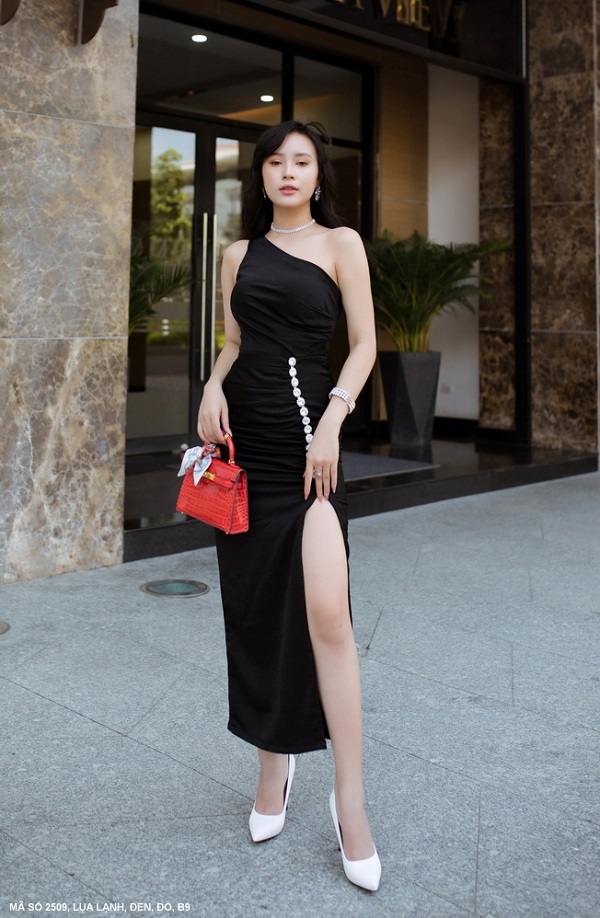 ĐẦM CỔ XÉO MỘT VAI ĐÍNH HẠT XOÀN XẺ LAI