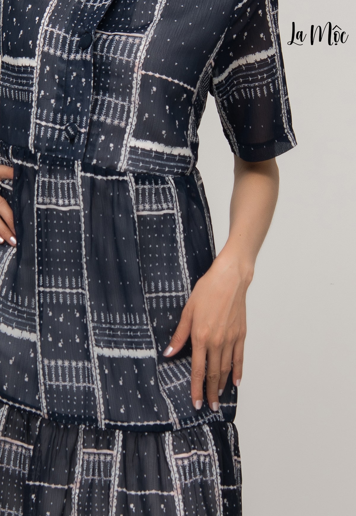 Đầm họa tiết sọc vuông, cổ trụ - LA MỘC chất liệu vải CHIFFON KOREA