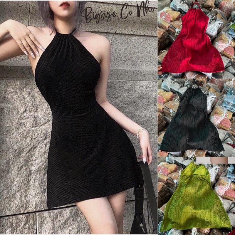 Đầm dây bigsize dáng váy A cổ yếm xẻ lai hai bên chất gân tăm, Váy nữ BIGSIZE CÔ NHỎ co giãn từ 60-93kg G84