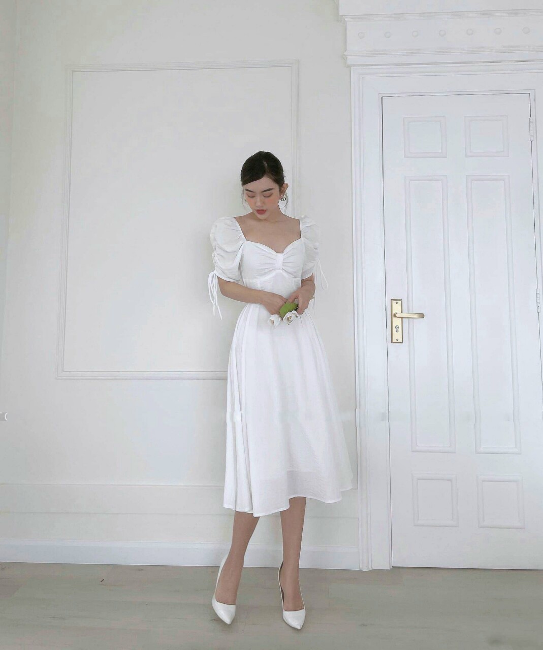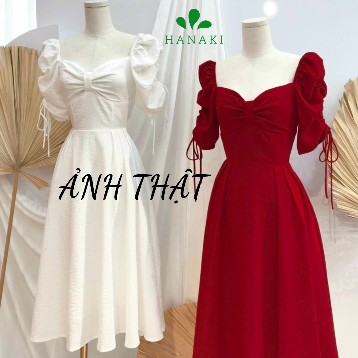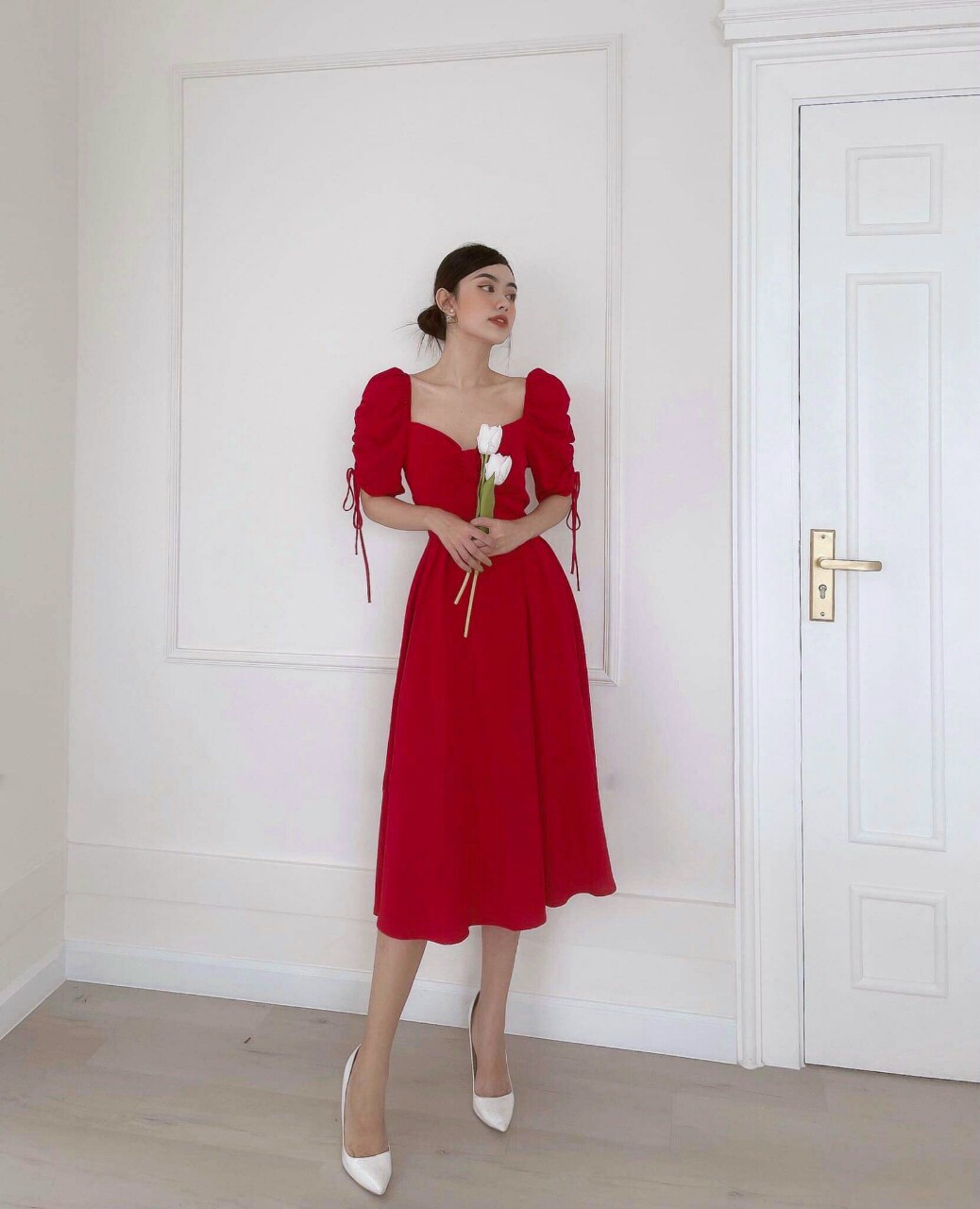 - Đầm tay phồng cổ nhún 2 màu trắng, đỏ thích hợp mặc dự tiệc, đi chơi, du lịch