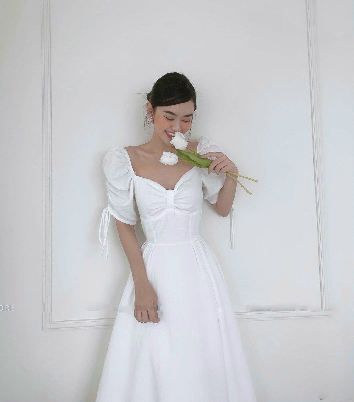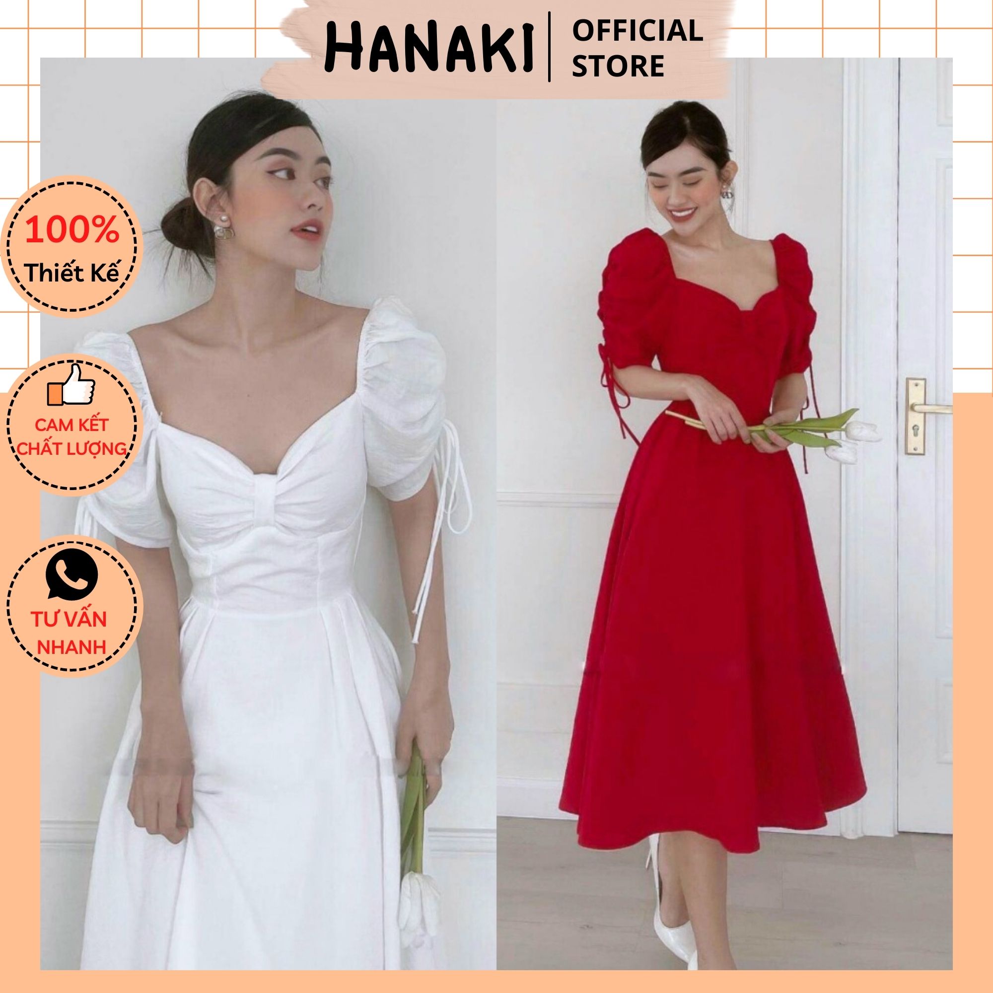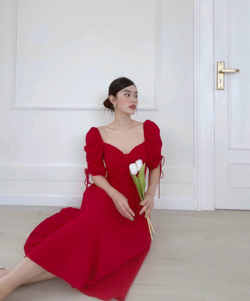 - Đầm tay phồng cổ nhún 2 màu trắng, đỏ thích hợp mặc dự tiệc, đi chơi, du lịch