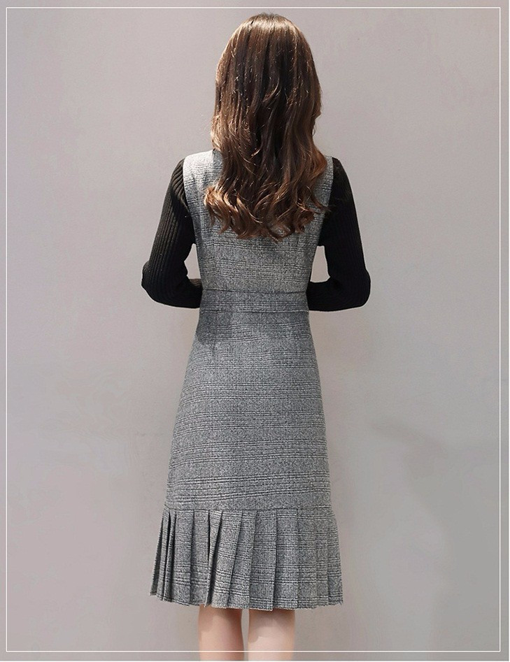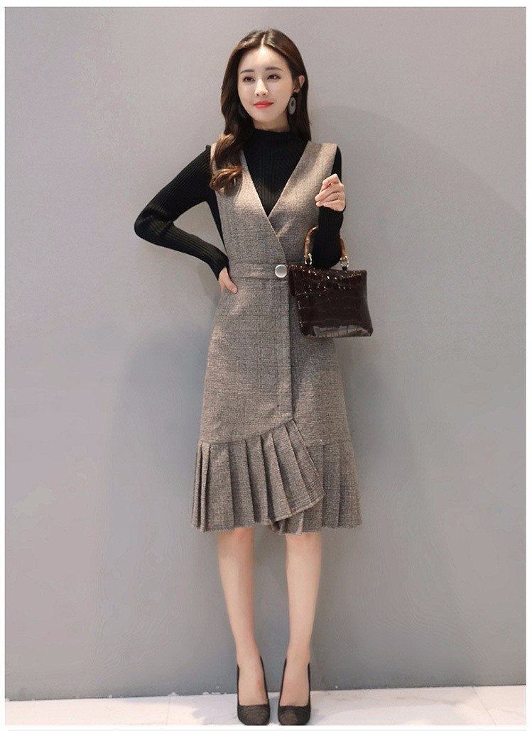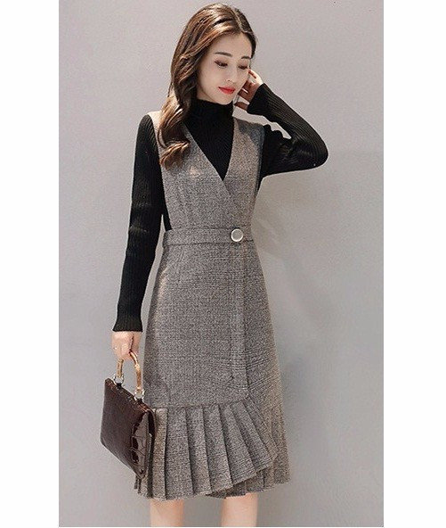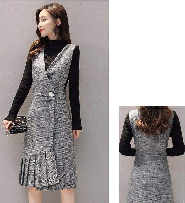 -Kiểu dáng: Đầm suông trên đầu gối, không aty, đính cúc, xếp bèo cách điệu.