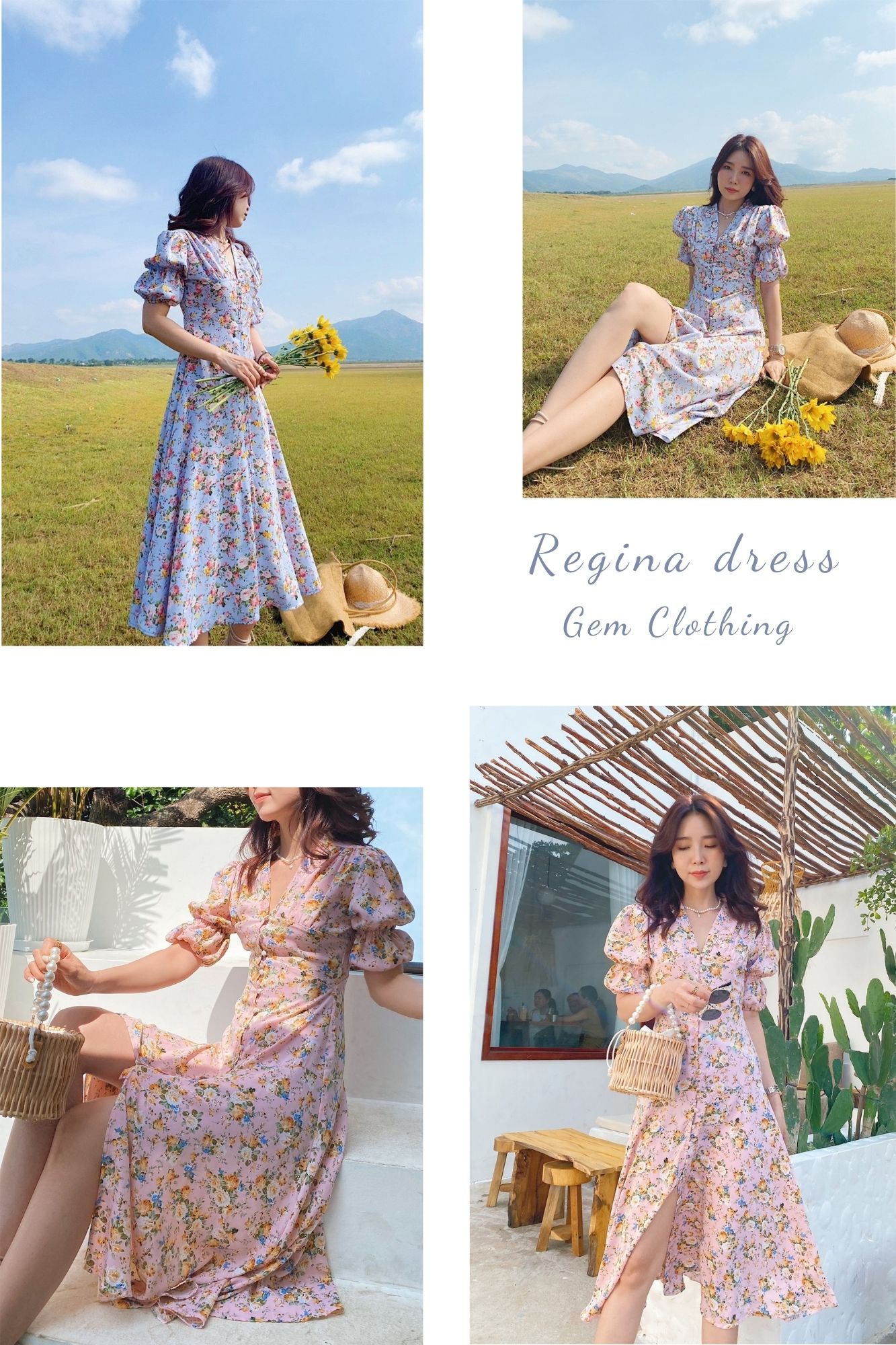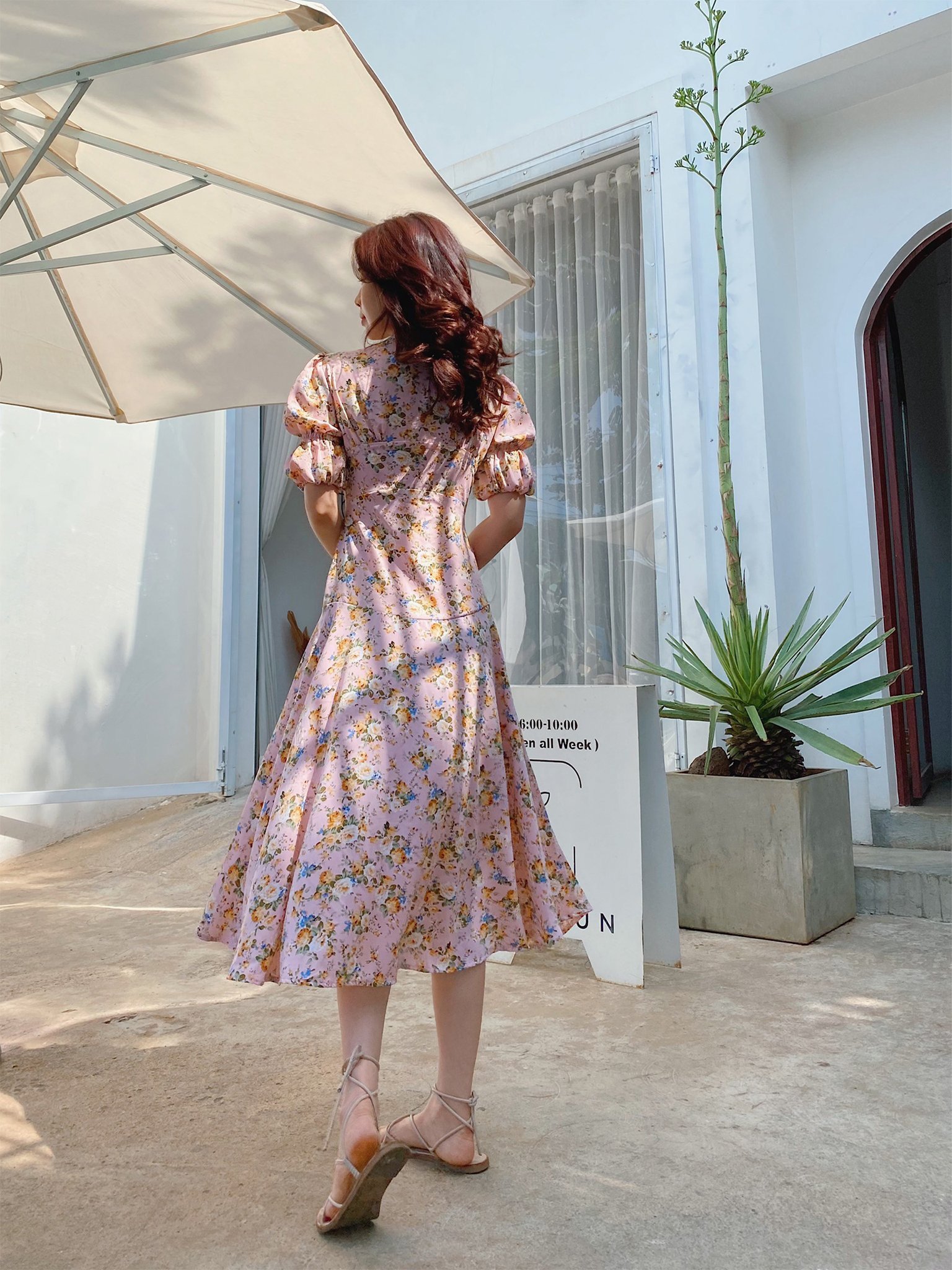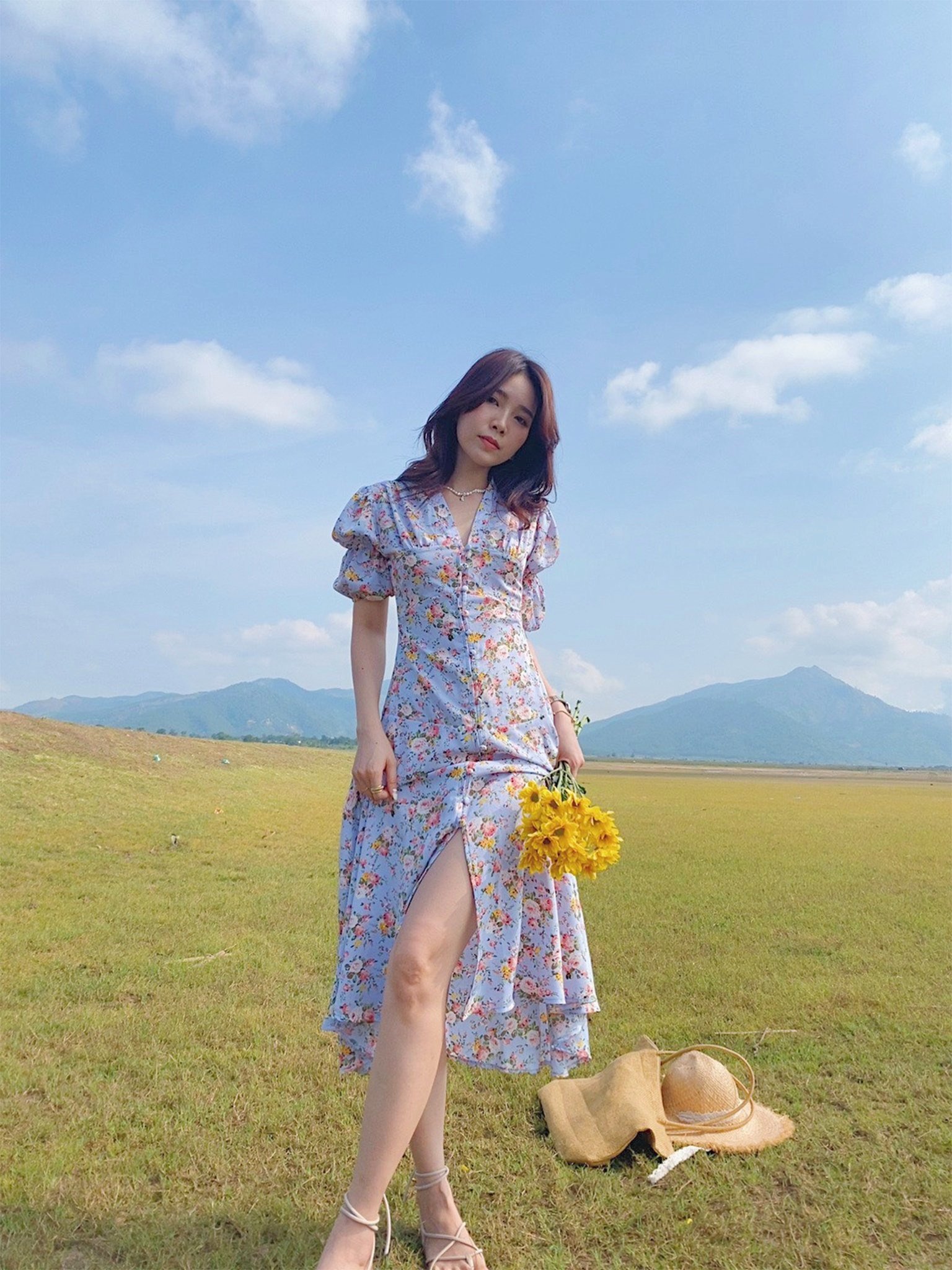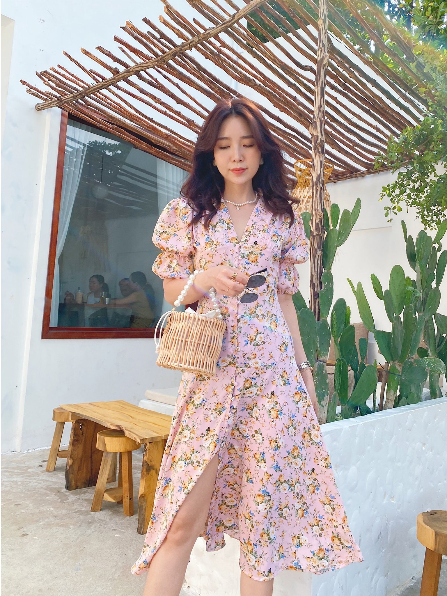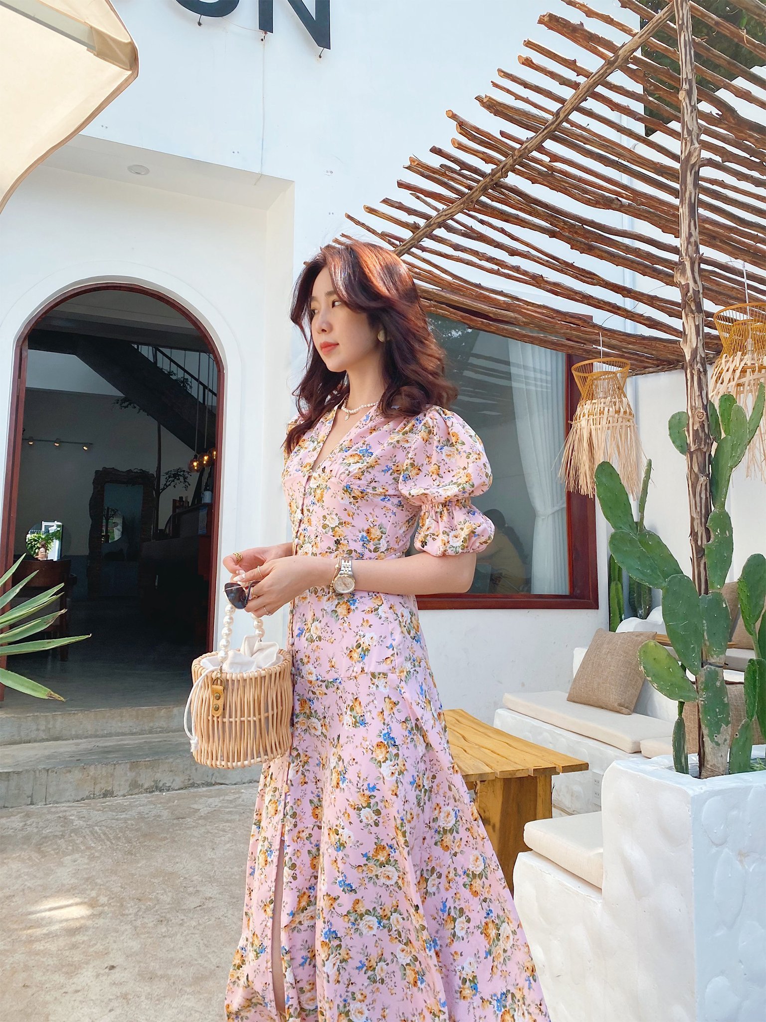 - Kiểu dáng dài với thiết kế cổ V vintage, nhẹ nhàng kết hợp hàng nút trước nổi bật, tạo điểm nhấn cho chiếc đầm