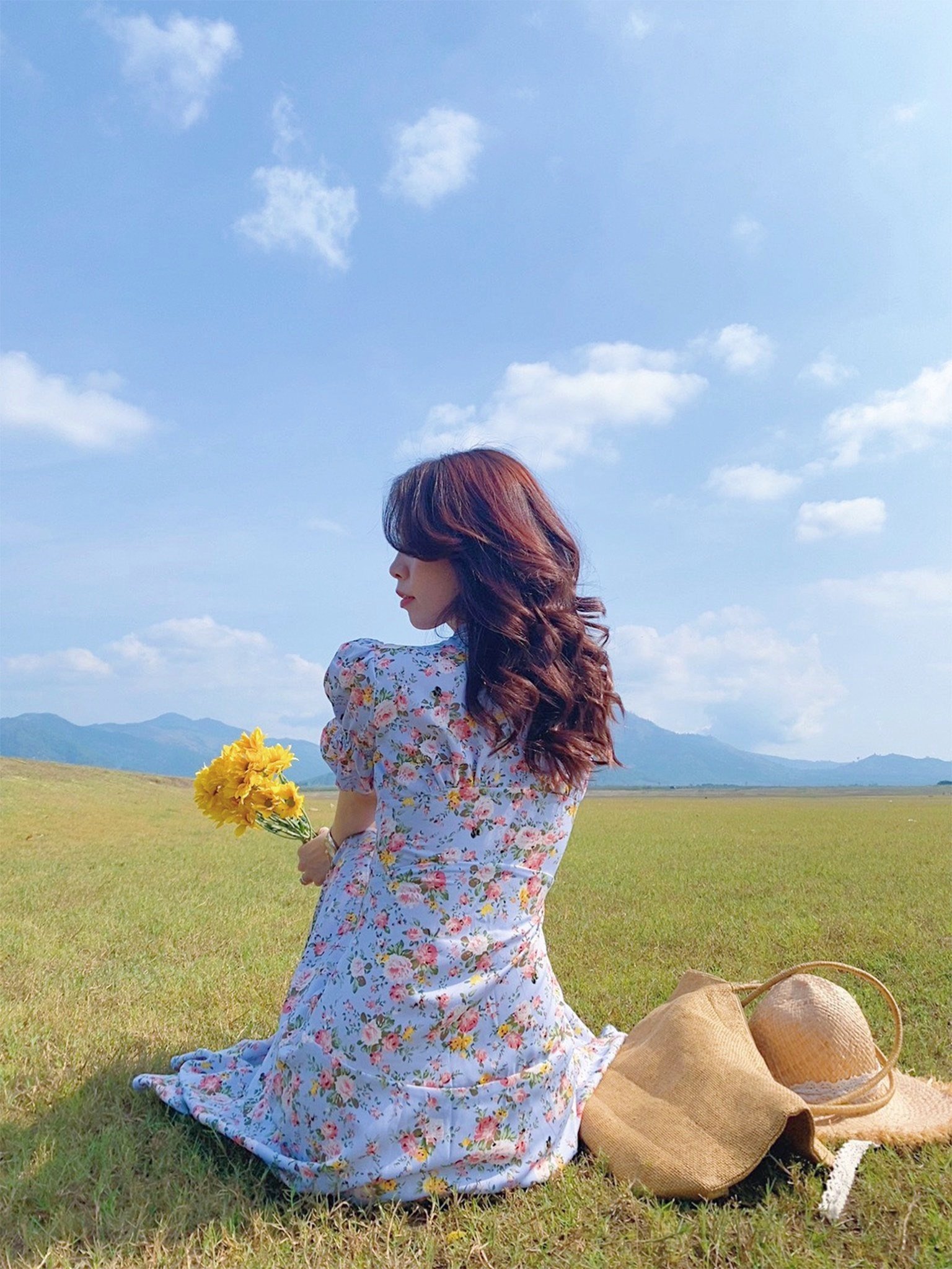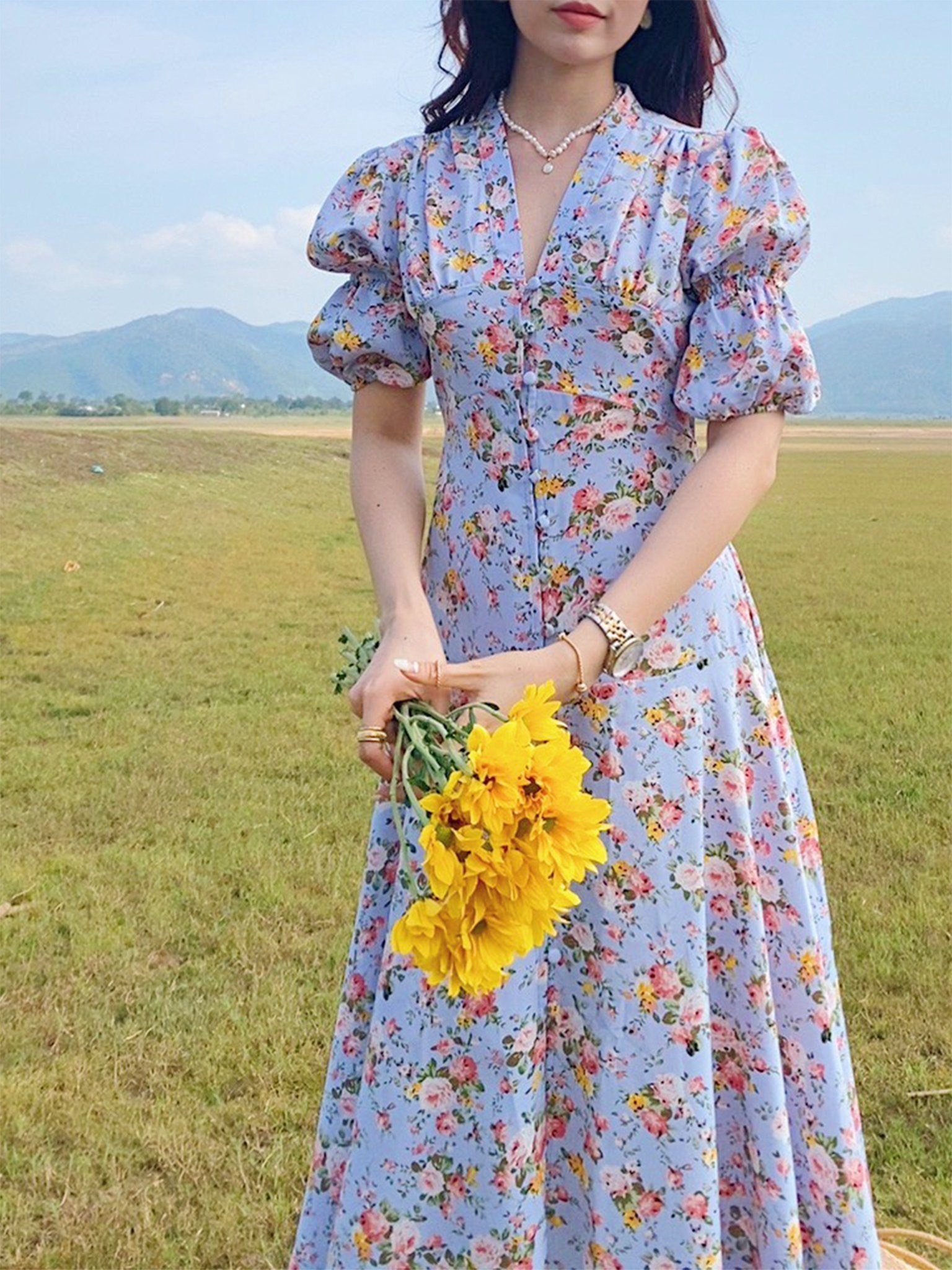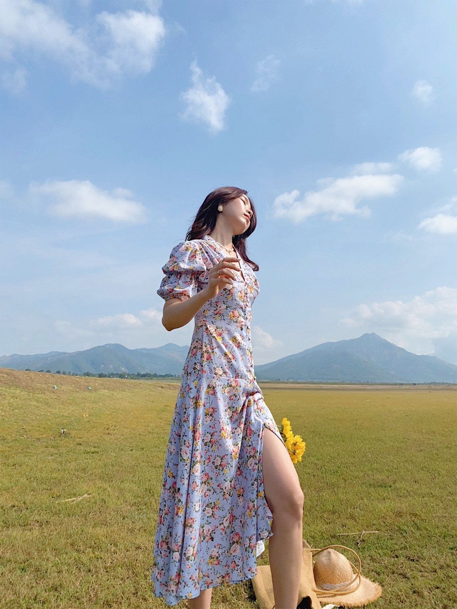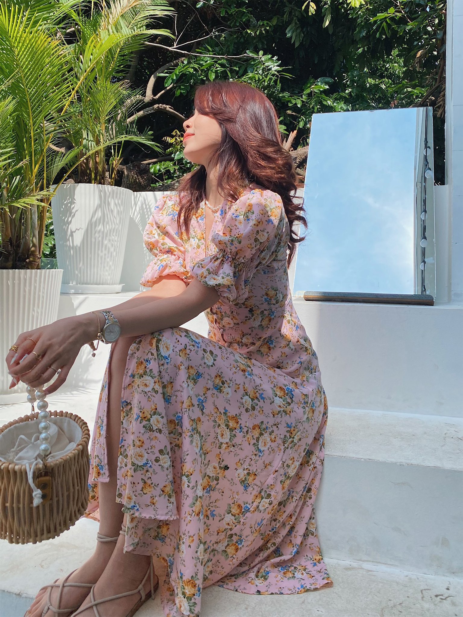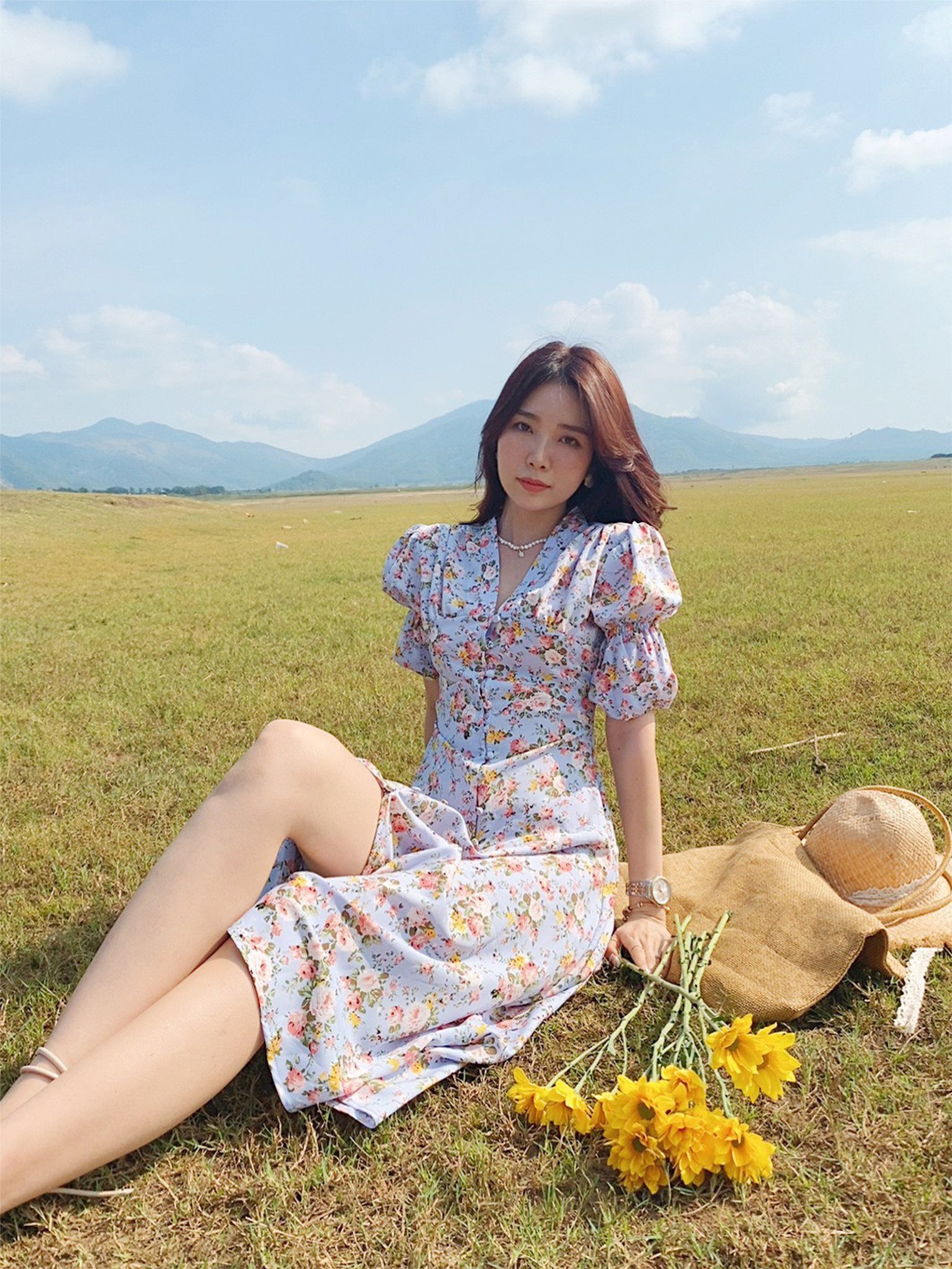 - Kiểu dáng dài với thiết kế cổ V vintage, nhẹ nhàng kết hợp hàng nút trước nổi bật, tạo điểm nhấn cho chiếc đầm