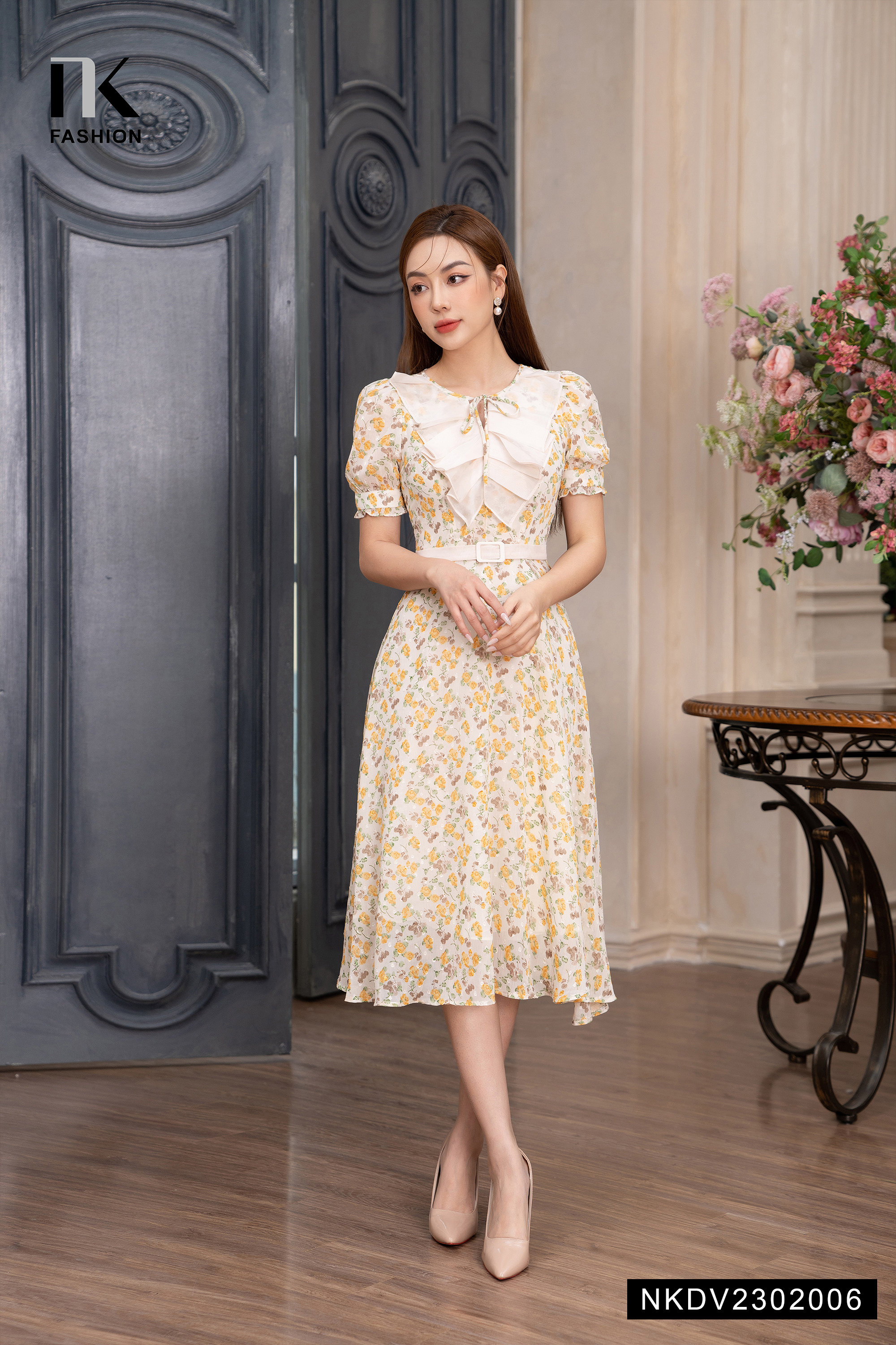 + Đầm nữ thiết kế dáng xòe nhẹ nhàng che khuyết điểm, thiết kế đai bọc, cổ phối bèo thắt nơ nữ tính thanh lịch