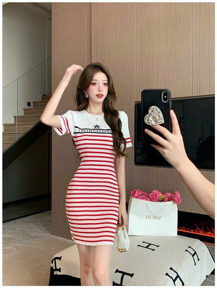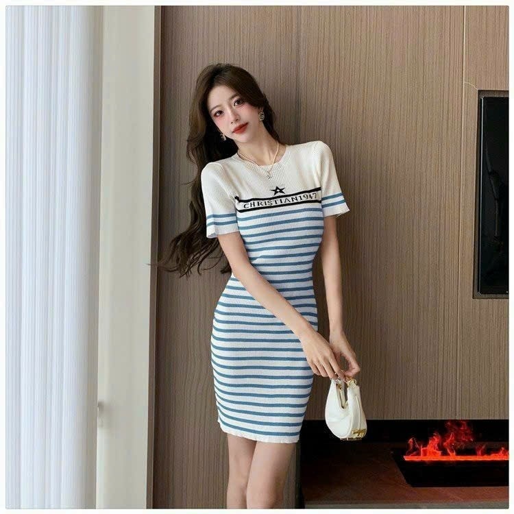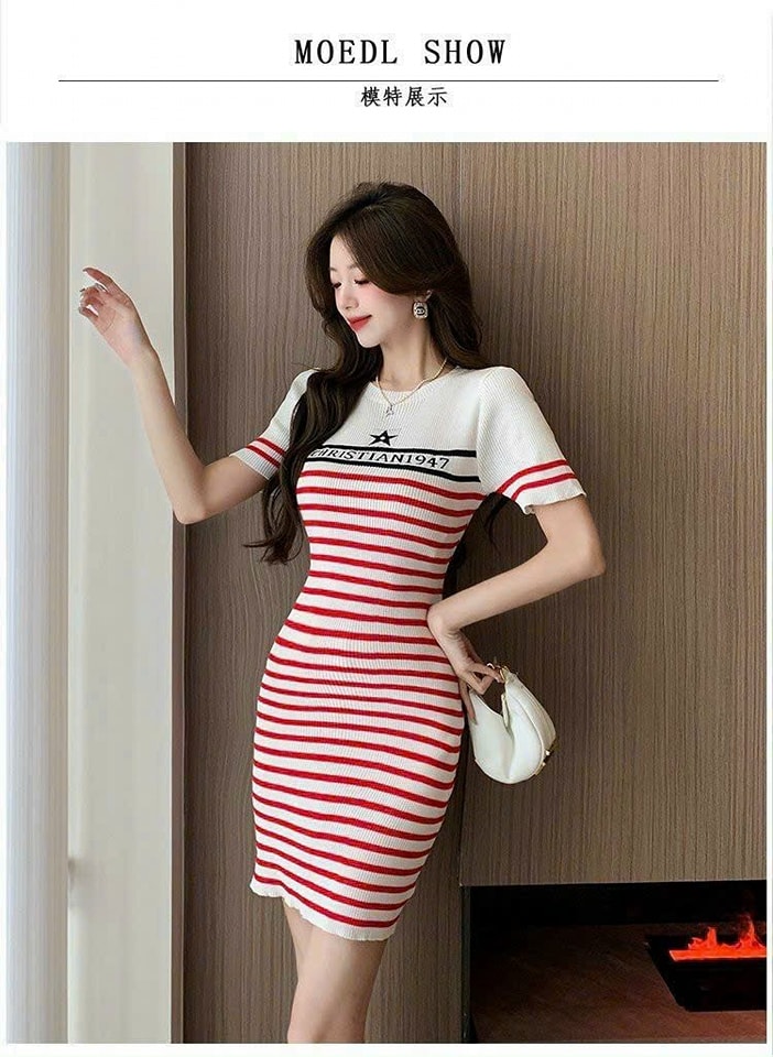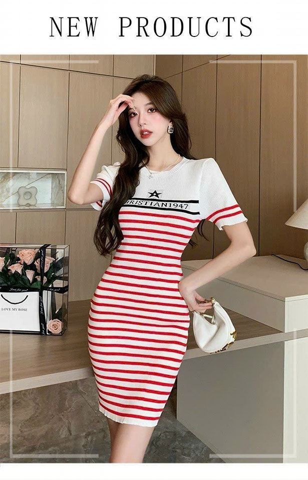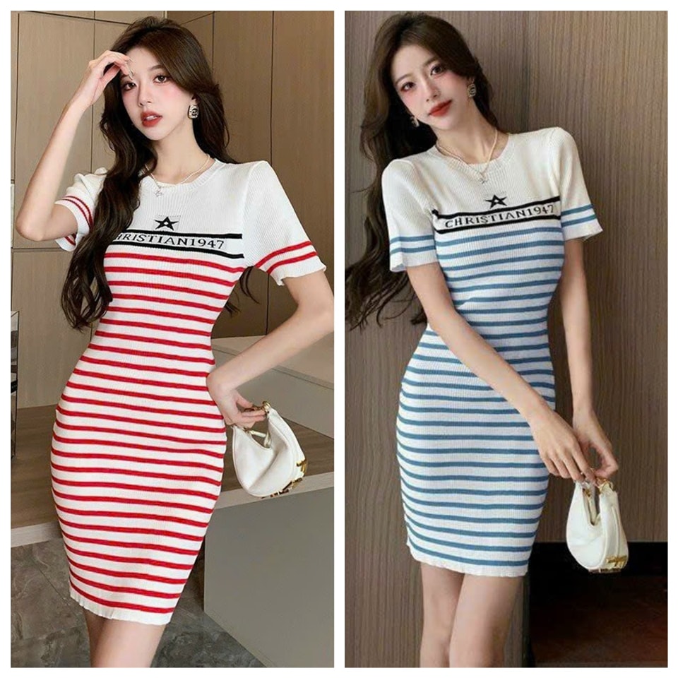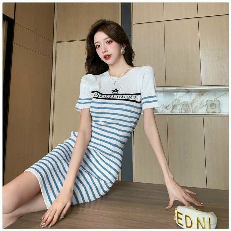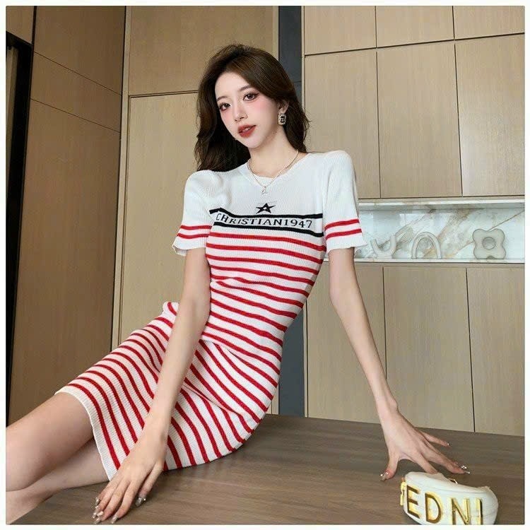 Đầm len sọc body phối màu in chữ CR 1947 (Hàng nhập)