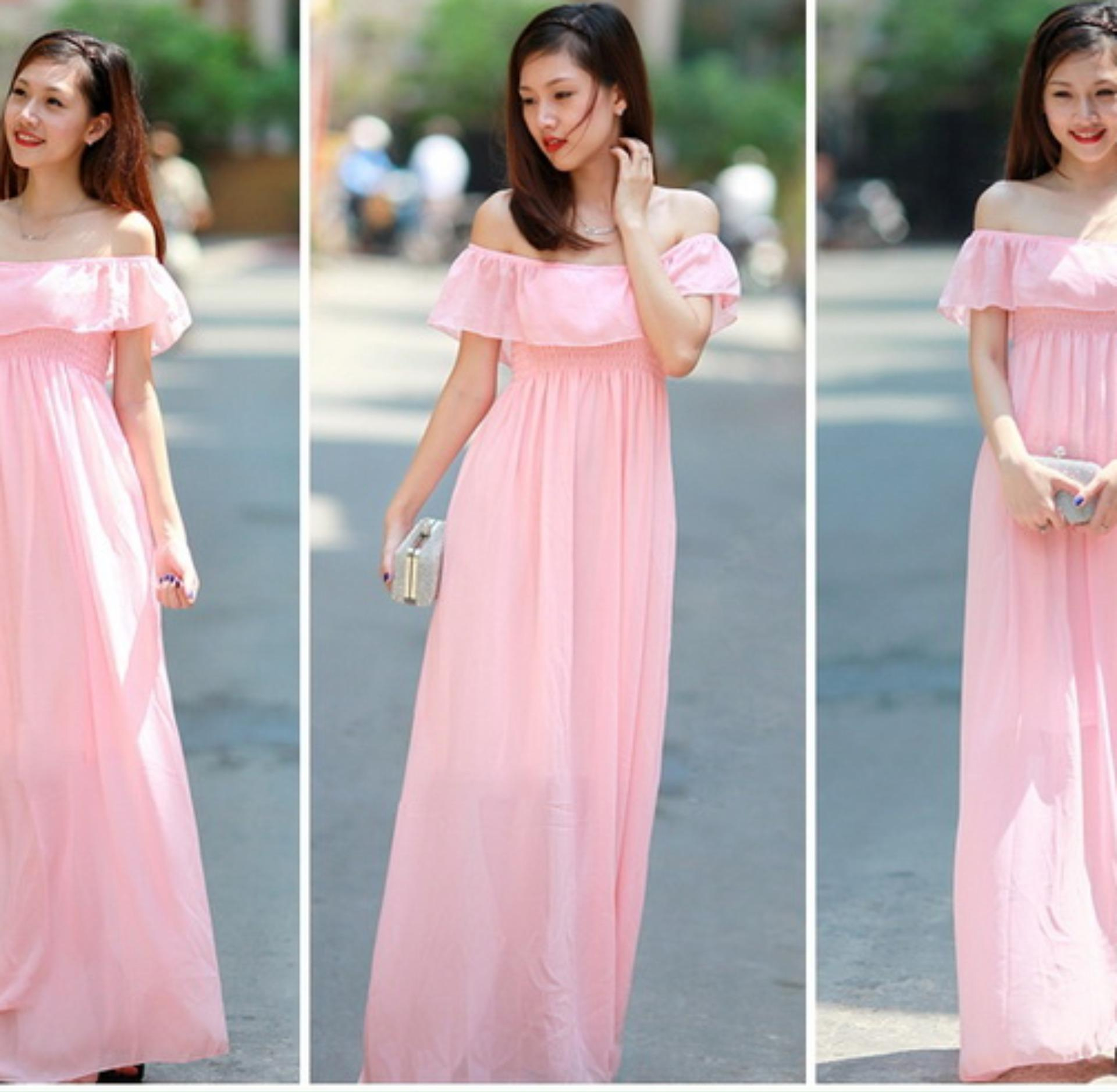 - Đầm maxi bẹt vai nhúng (dâu) Là thiết kế dành riêng cho mùa hè nên có màu sắc rất nhẹ nhàng và thanh thoát.