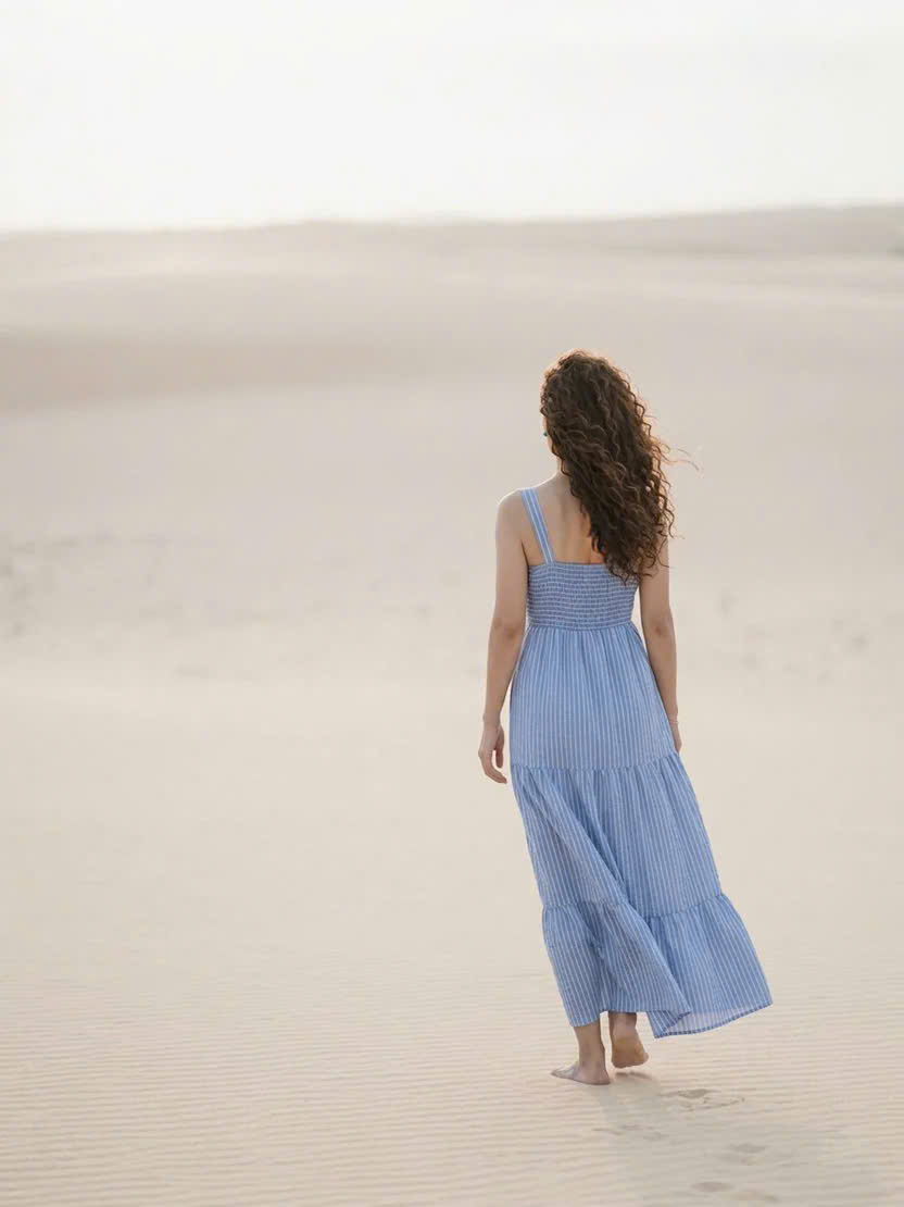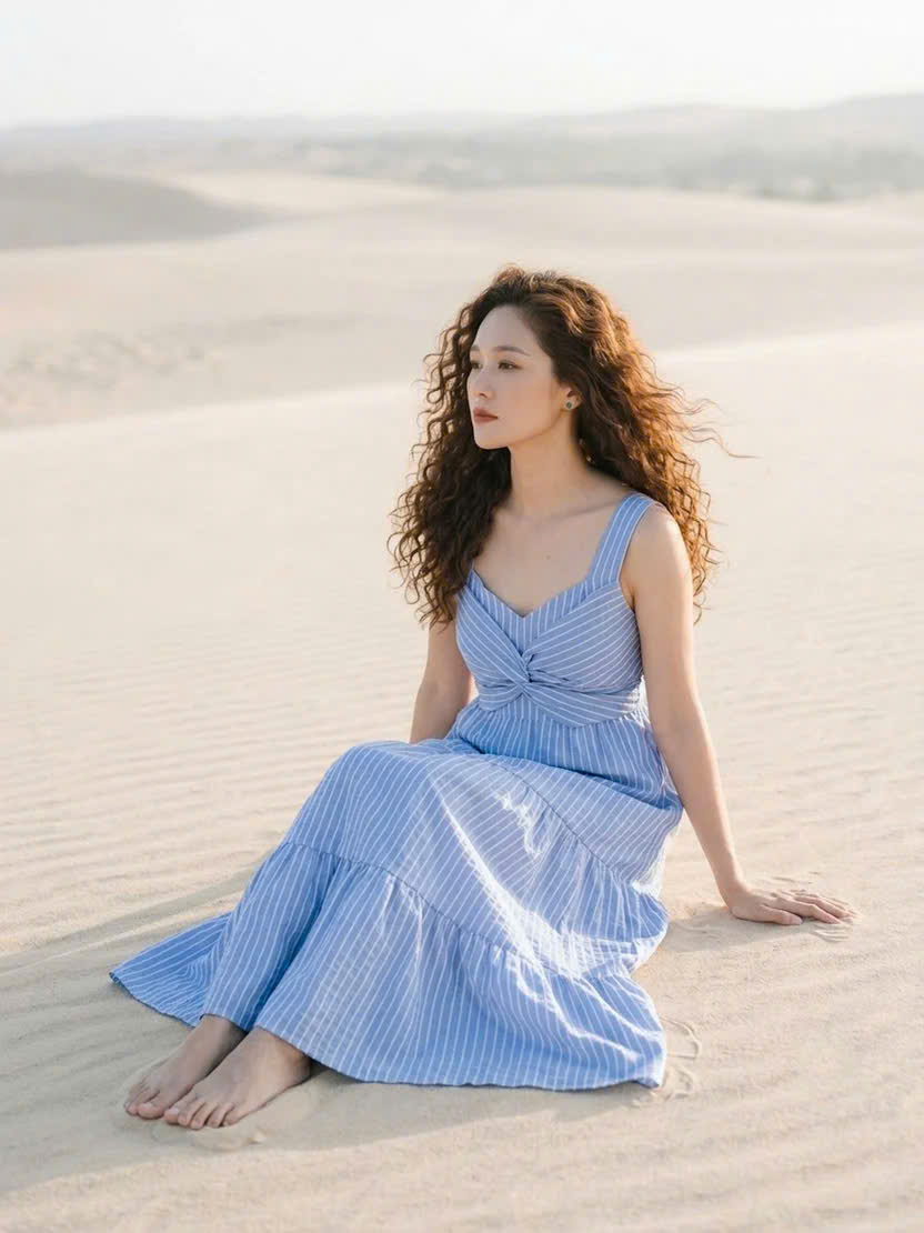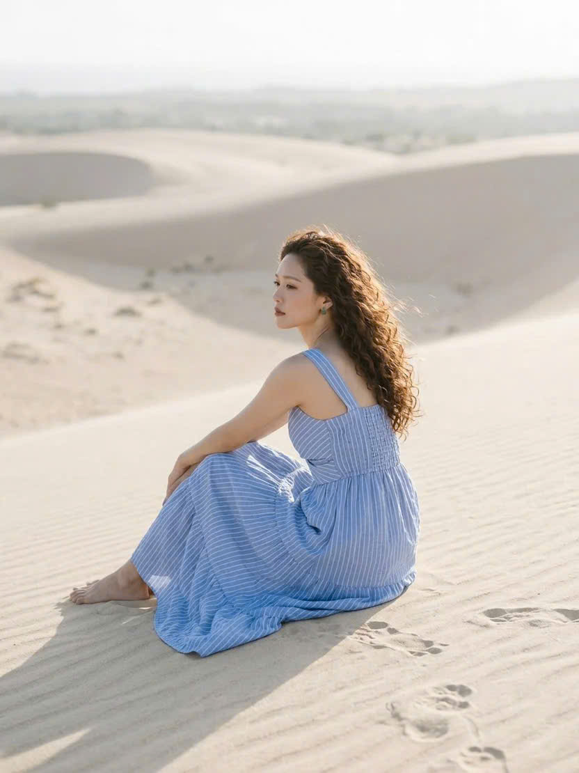 Trong bộ sưu tập Thanh Minh, ta tìm thấy Vân Hy — một hiện thân của sự minh định. Giữa những triền cát trắng xóa và hư ảo, Vân Hy đứng đó, không trang trí, không diễn giải quá mức. Thiết kế đầm maxi sọc xanh pastel với chi tiết xoắn ngực tinh xảo không nhằm tạo ra một biểu tượng để chiêm ngưỡng, mà để xây dựng một trạng thái để nhận diện: Khi ta đủ điều kiện bên trong, sự hiện diện tự nhiên sẽ xuất hiện.