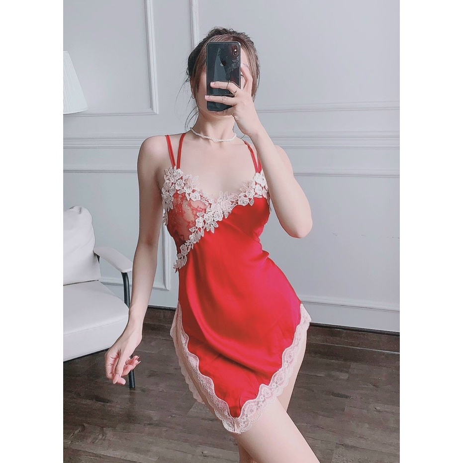 Giới thiệu Đầm ngủ nữ hai dây sexy satin cao cấp mềm mịn phối ren Ngực quyến rũ gợi cảm Vạc Chéo MInhduongct