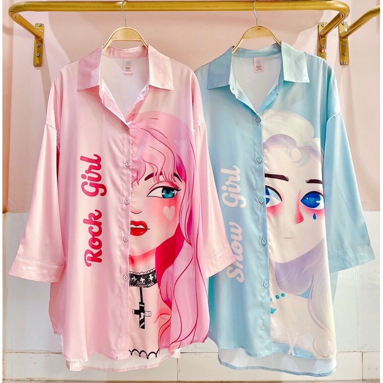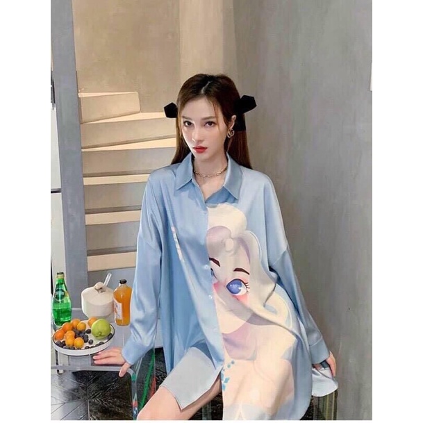 Đầm ngủ sơ mi in hình cô gái tóc mây lụa satin cao cấp quảng châu