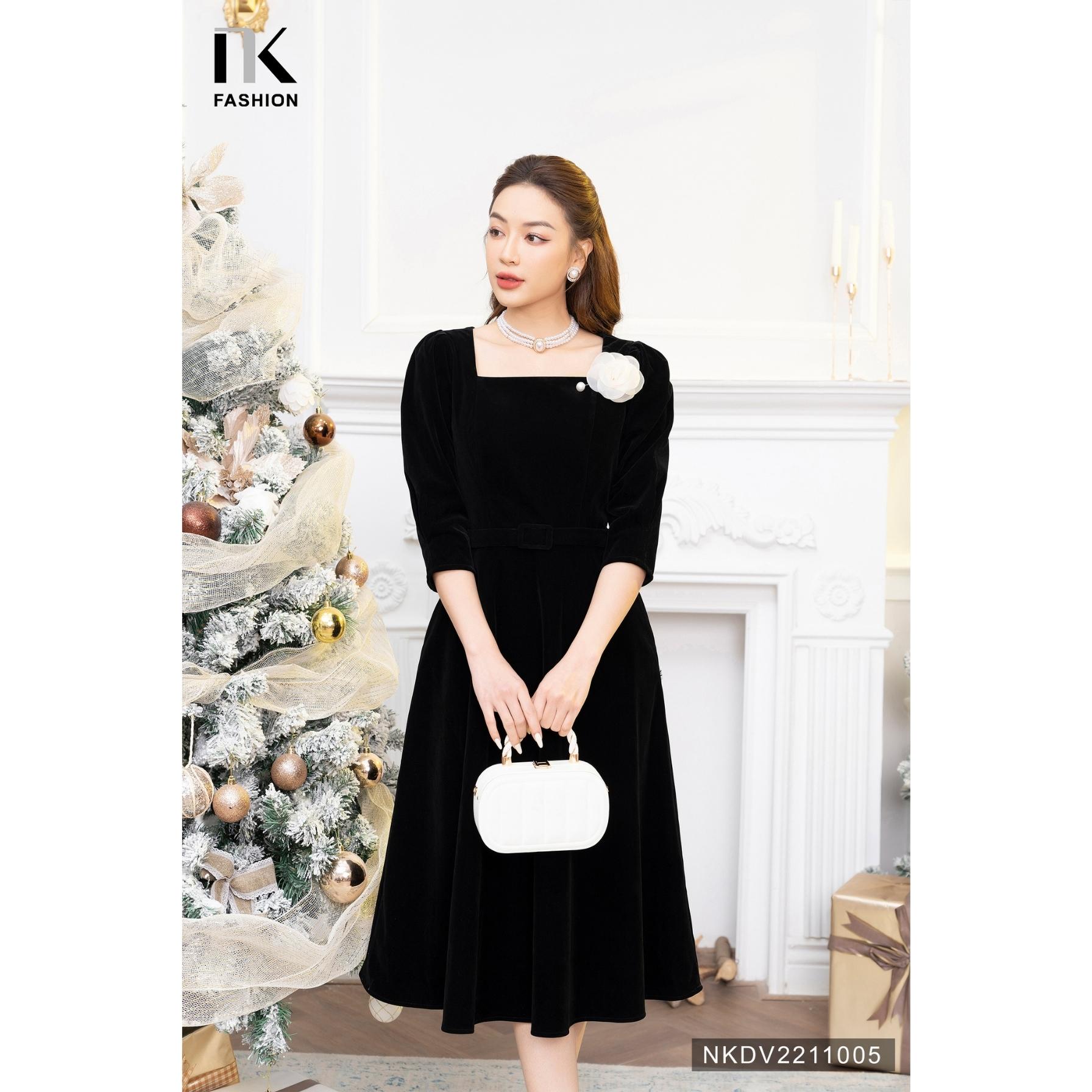 + Đầm nhung thiết kế dáng xòe, cổ vuông, tay bồng tiểu thư phù hợp với đi chơi, đi làm, đi dự tiệc,...