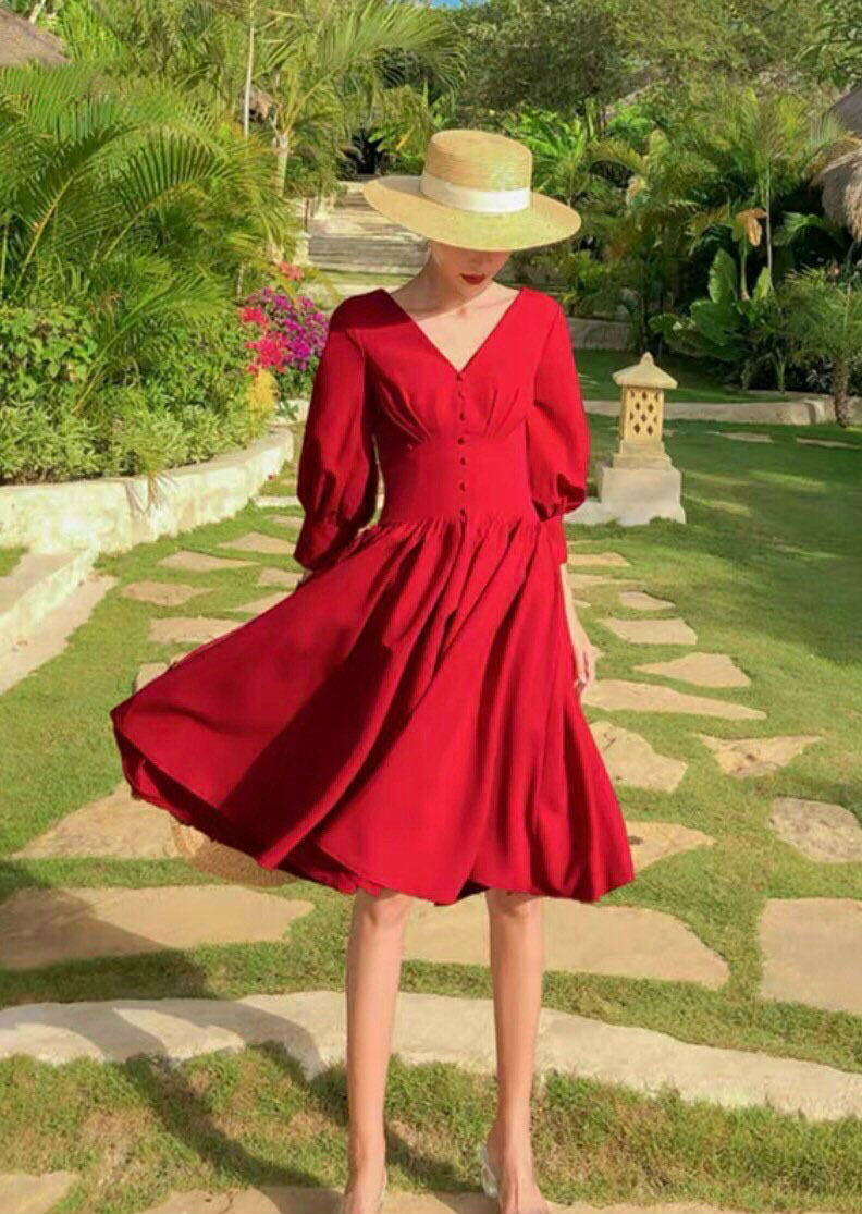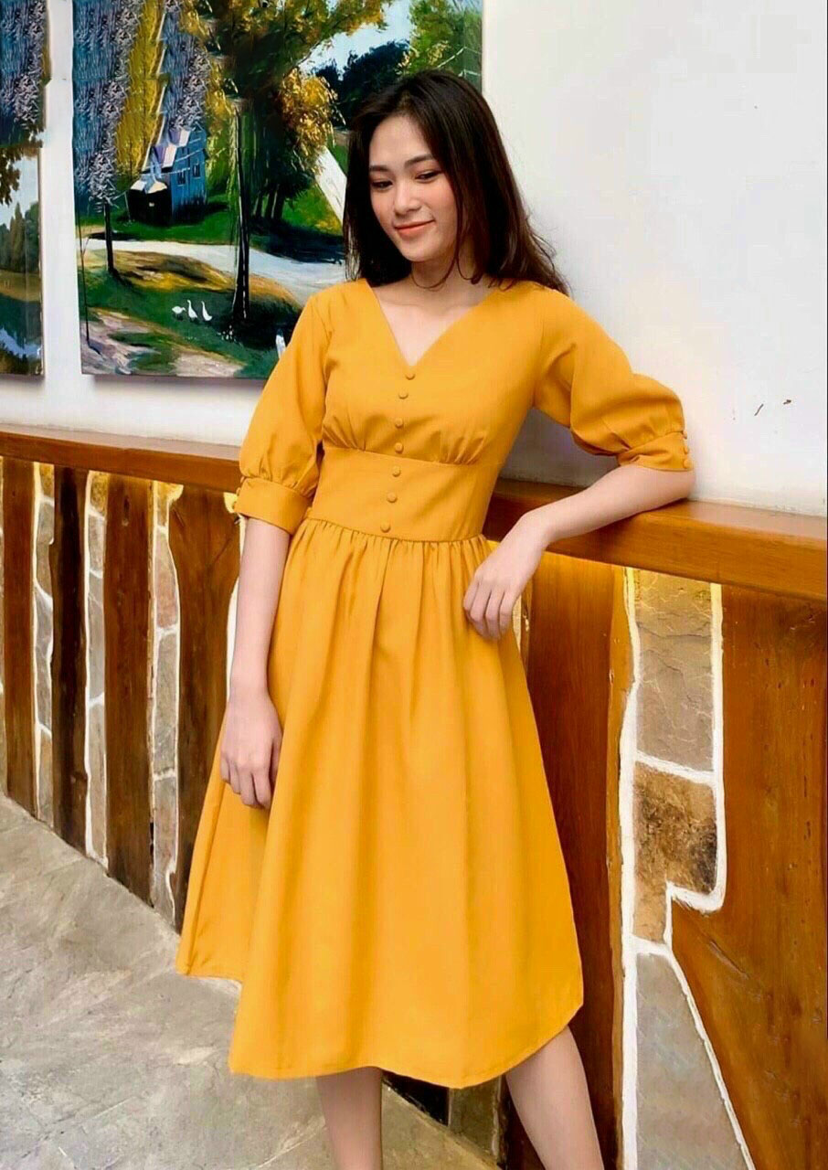 Thiết kế Đầm nữ cổ tim nút bọc tay phồng thời trang cao cấp phong cách đường may tỉ mỉ.