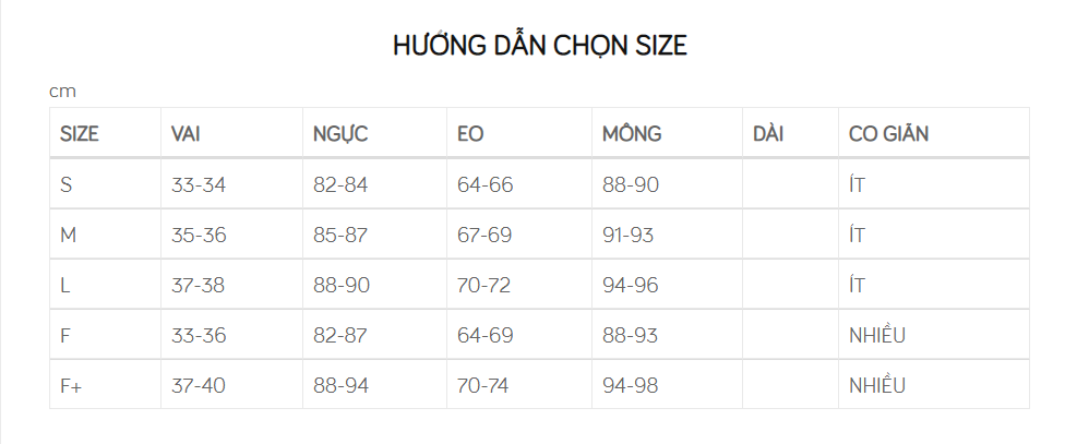Kích thước | Đầm có 2 size, size F và F+ Size F là thông số bằng size S, chất co giãn cực tốt nên người size S và M mặc chung size FSize F+ dành cho người size L và 1 số ít bạn dáng XL nhưng cao và có eo* Size F : Dài đầm 92cm , Ngắn đầm 76cm , Dài tay 20cmVòng ngực: 78-90cm , Vòng eo: 60-70cm , Vòng mông 84-96cm* Size F+ : Dài đầm 94cm , Ngắn đầm 78cm , Dài tay 20cmVòng ngực: 88-100cm , Vòng eo: 70-80cm , Vòng mông 94-106cm |