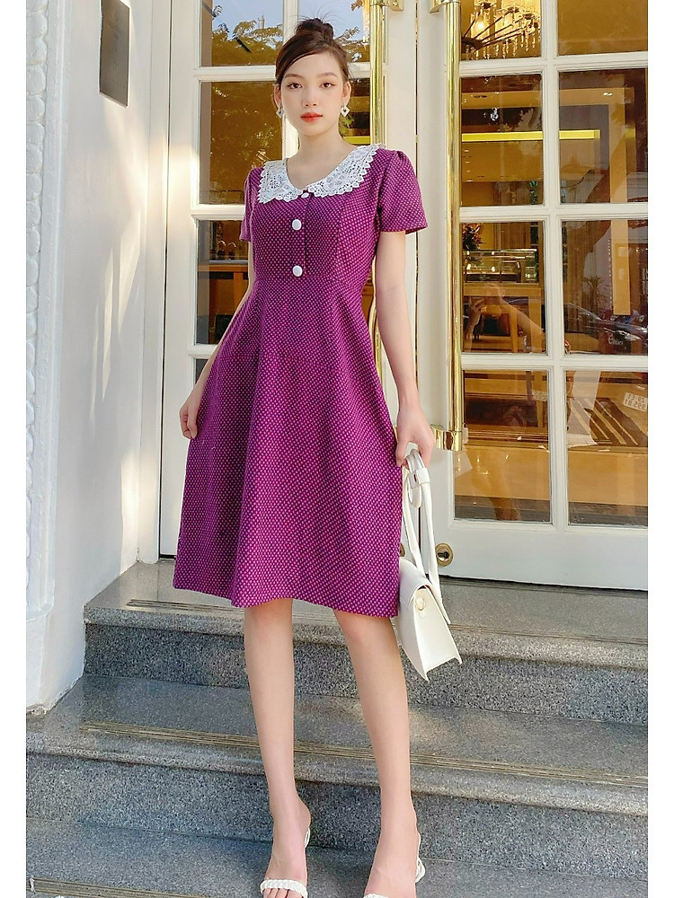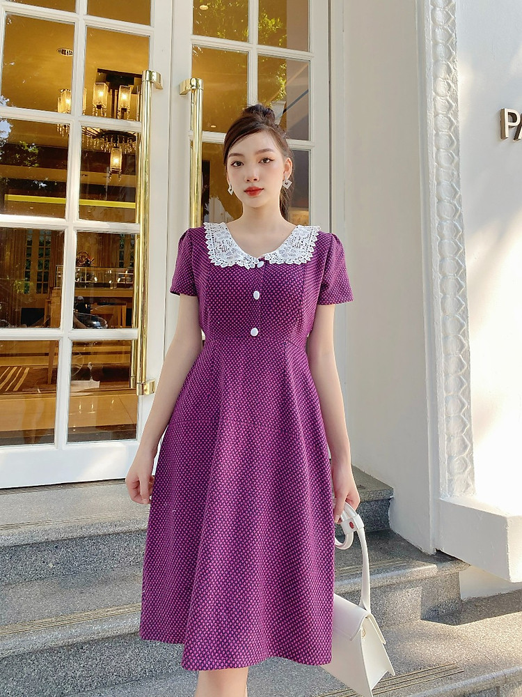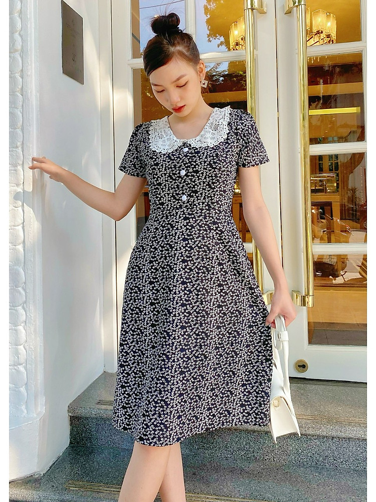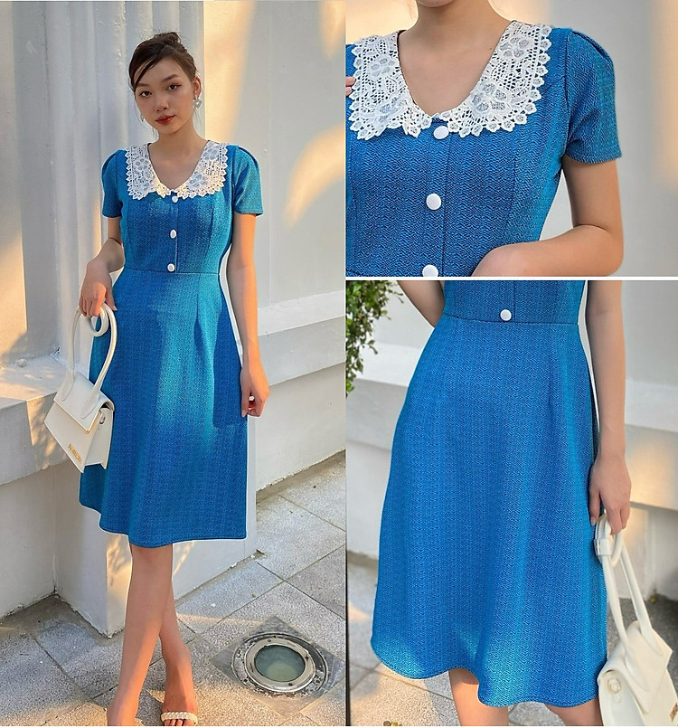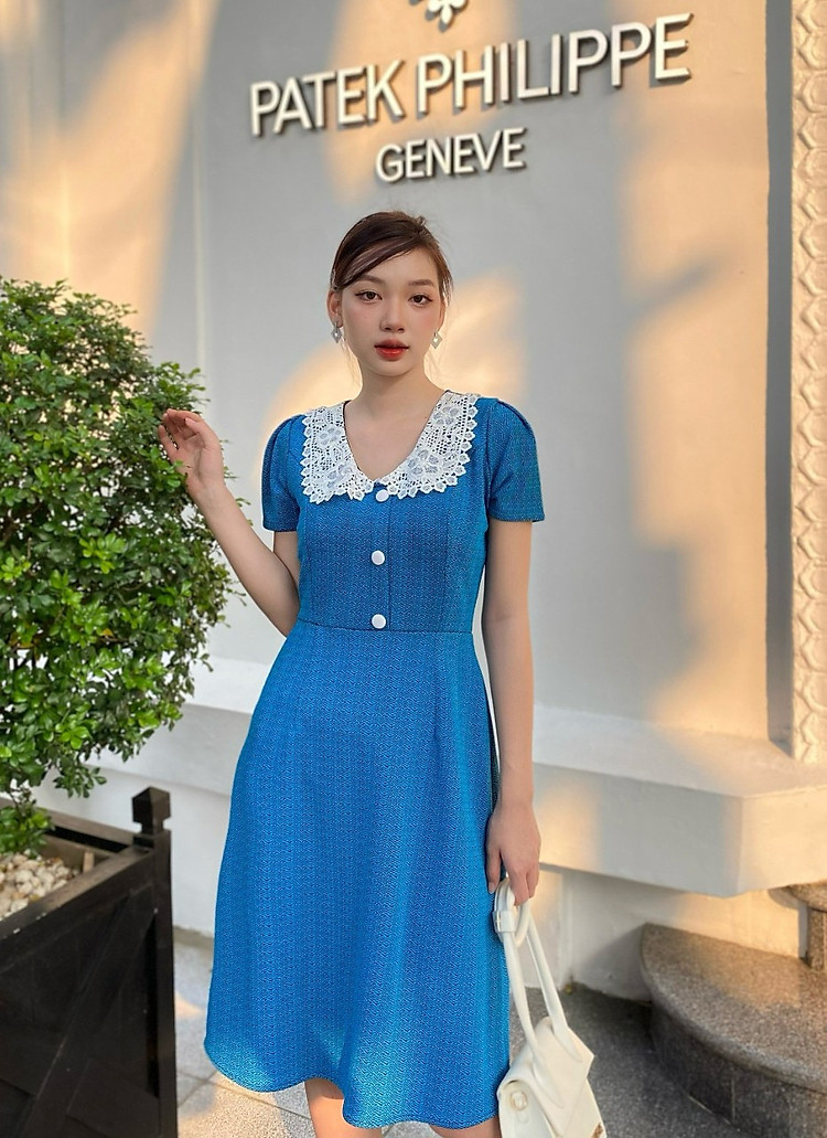 Đầm suôn cổ ren thêu phối nút bọc duyên dáng D057 - Lady Fashion
