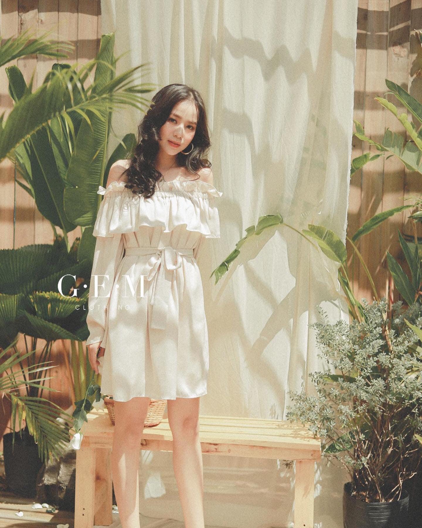 - Form đầm suông rộng với nhấn nhá thêm chút bèo và nơ eo tăng phần nữ tính