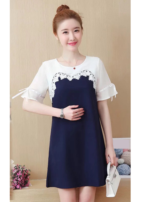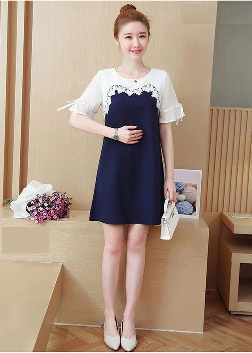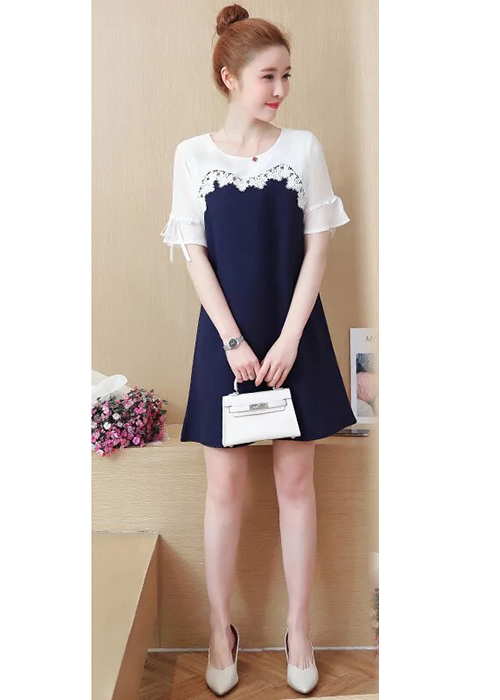 Kiểu Dáng: Thiết Kế Cổ Tròn, Tay Ngắn Đính Dây Nơ Duyên Dáng, Ngực Phối Ren Trẻ Trung, Kết Hợp Phối Màu Xanh Trắng Thêm Phần Tươi Trẻ, Đáng Yêu Cho Bạn Nữ Khi Xuống Phố