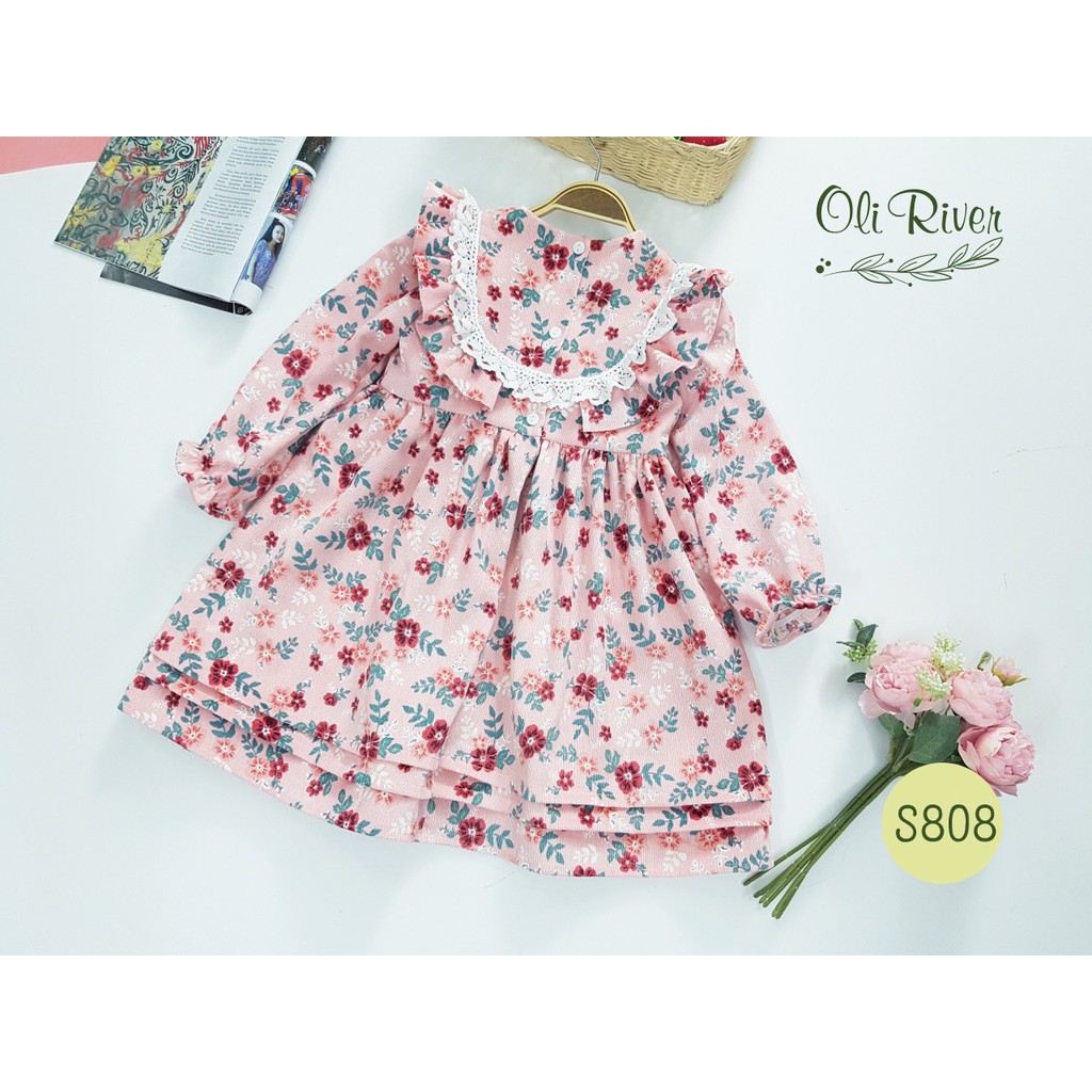 S808 - Bồng bềnh đáng yêu với thiết kế bèo xếp tầng ở cổ và đuôi váy trên nên vải hoa nhung tăm hồng pastel ấm áp chỉ có ở thiết kế nhà #oliriver.